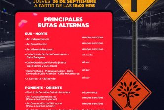 - Se realizará el jueves 26 de septiembre después a las 16:00 horas, sobre boulevard a Zacatecas, Petróleos Mexicanos, 5 de Mayo, López Mateos, Galeana y Moctezuma