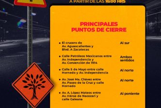 Por lo anterior, los cierres se llevarán a cabo en boulevard a Zacatecas entre el distribuidor vial y Convención Norte; Petróleos Mexicanos, entre Convención Norte y avenida Independencia; 5 de Mayo, entre avenida Independencia y López Mateos; 5 de Mayo, entre Ignacio Zaragoza y Adolfo López Mateos; Paseo de la Cruz y José María Chávez y en López Mateos y Héroe de Nacozari.
