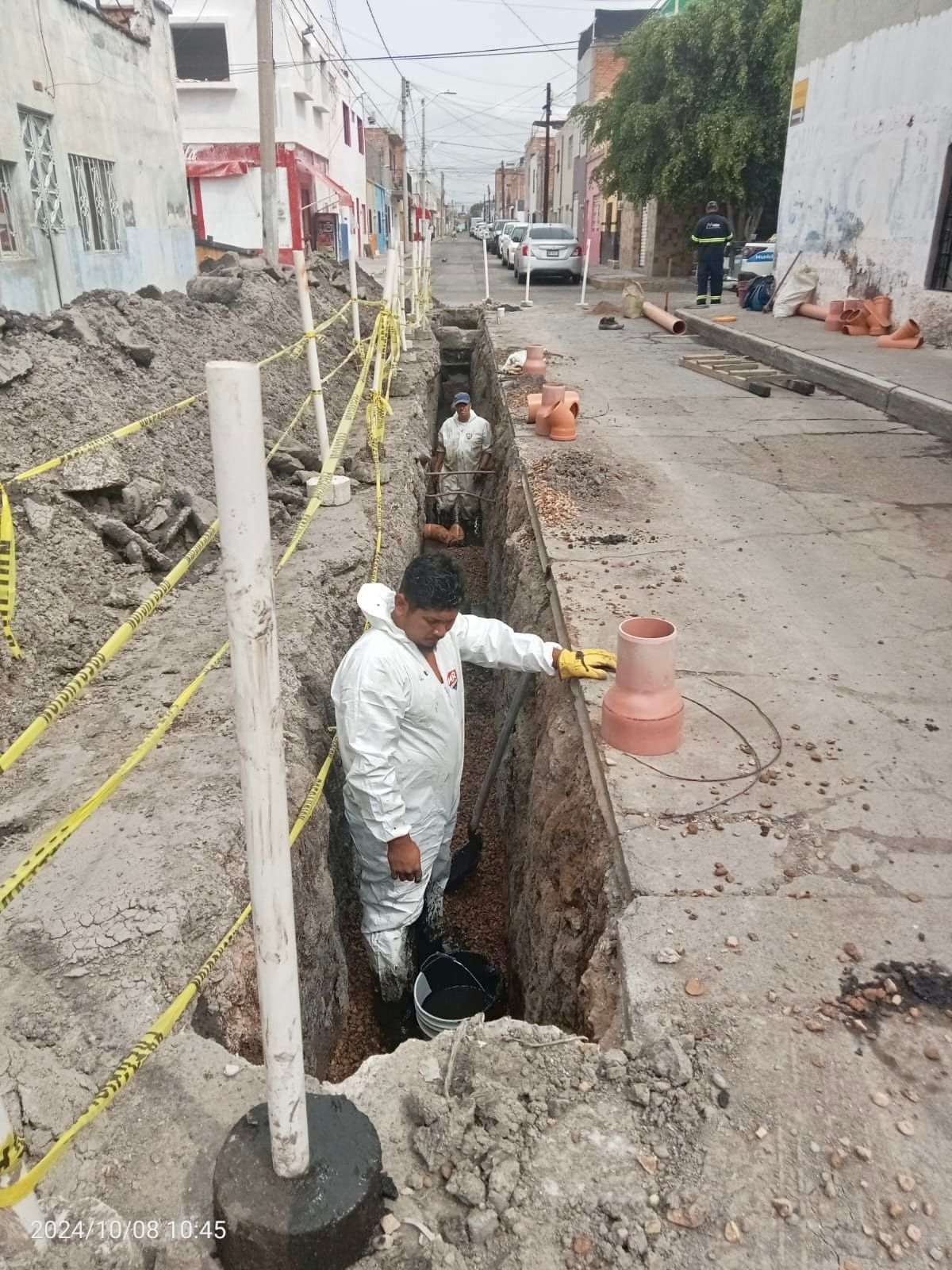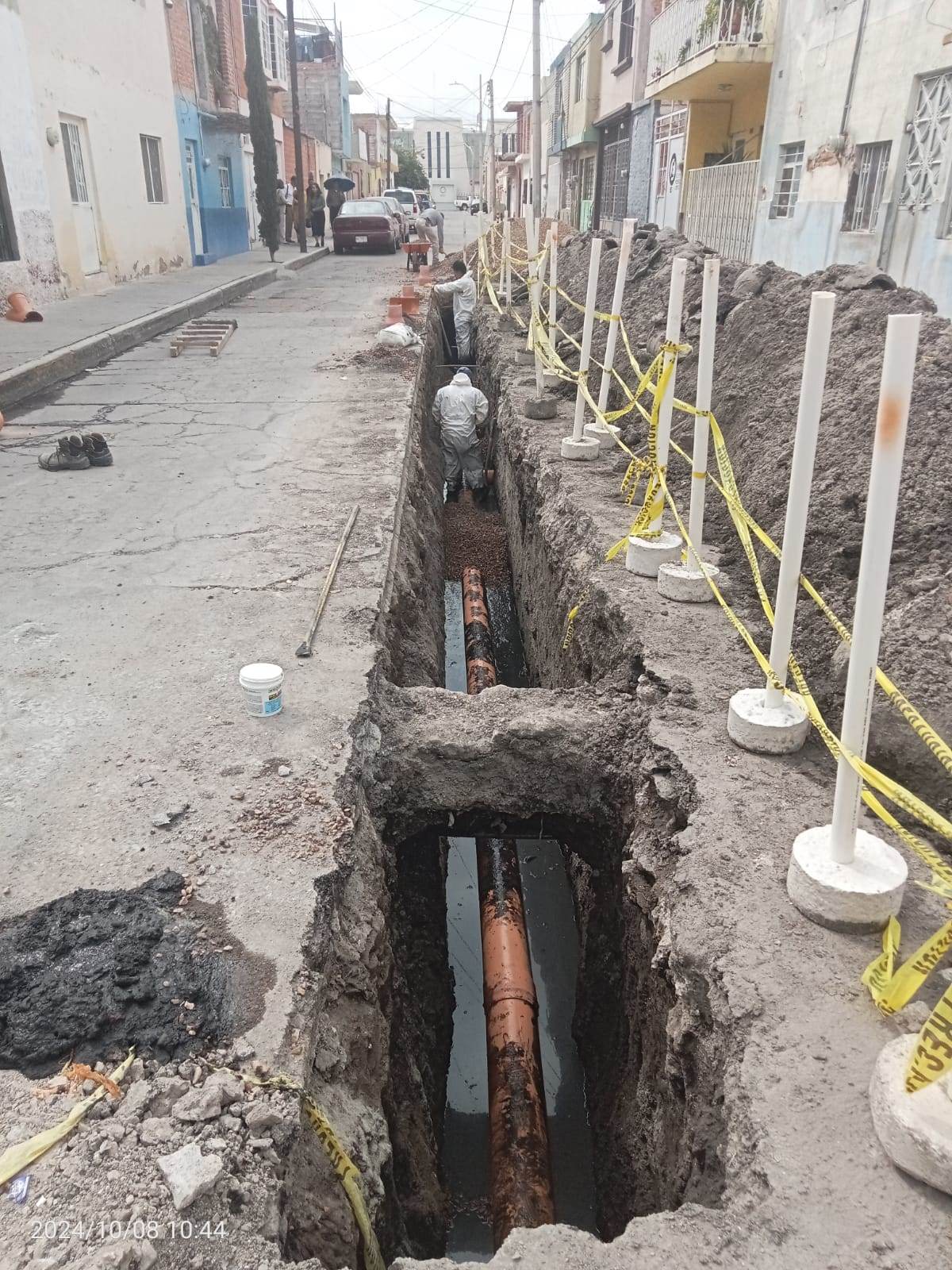 El Modelo Integral de Aguas de Aguascalientes (MIAA) trabaja en la rehabilitación de tubería de alcantarillado sanitario de 8 pulgadas en la calle David Reynoso, entre las calles Navarrete y Pueblito en la colonia San Marcos para prevenir fugas y evitar riesgos sanitarios.