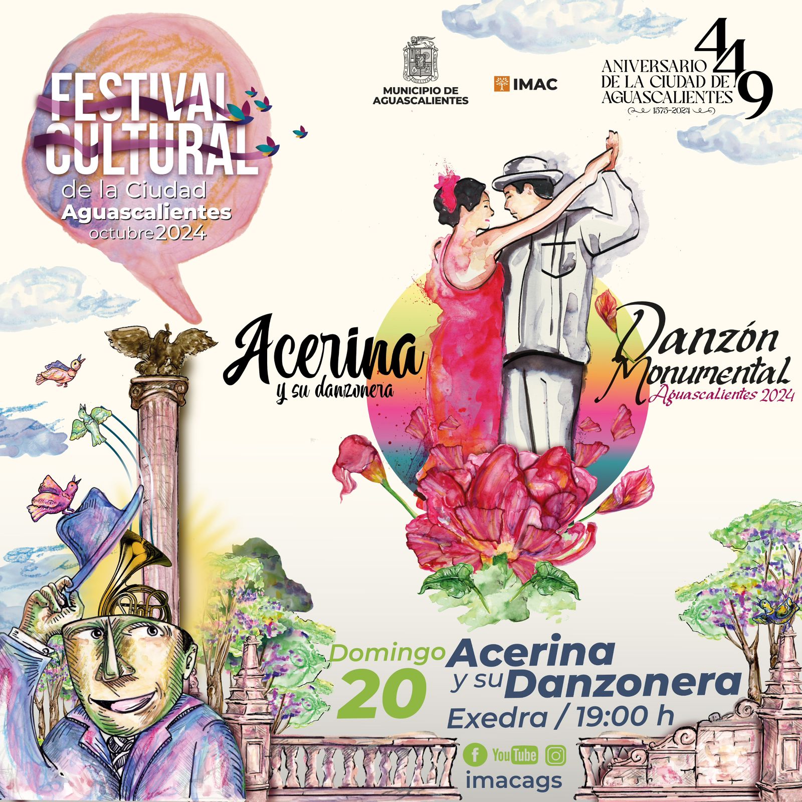 El Instituto Municipal Aguascalentense para la Cultura (Imac) invita al espectáculo de danzón monumental que encabezará Acerina y su Danzonera este domingo 20 de octubre a partir de las 19:00 horas en la Plaza de la Patria.