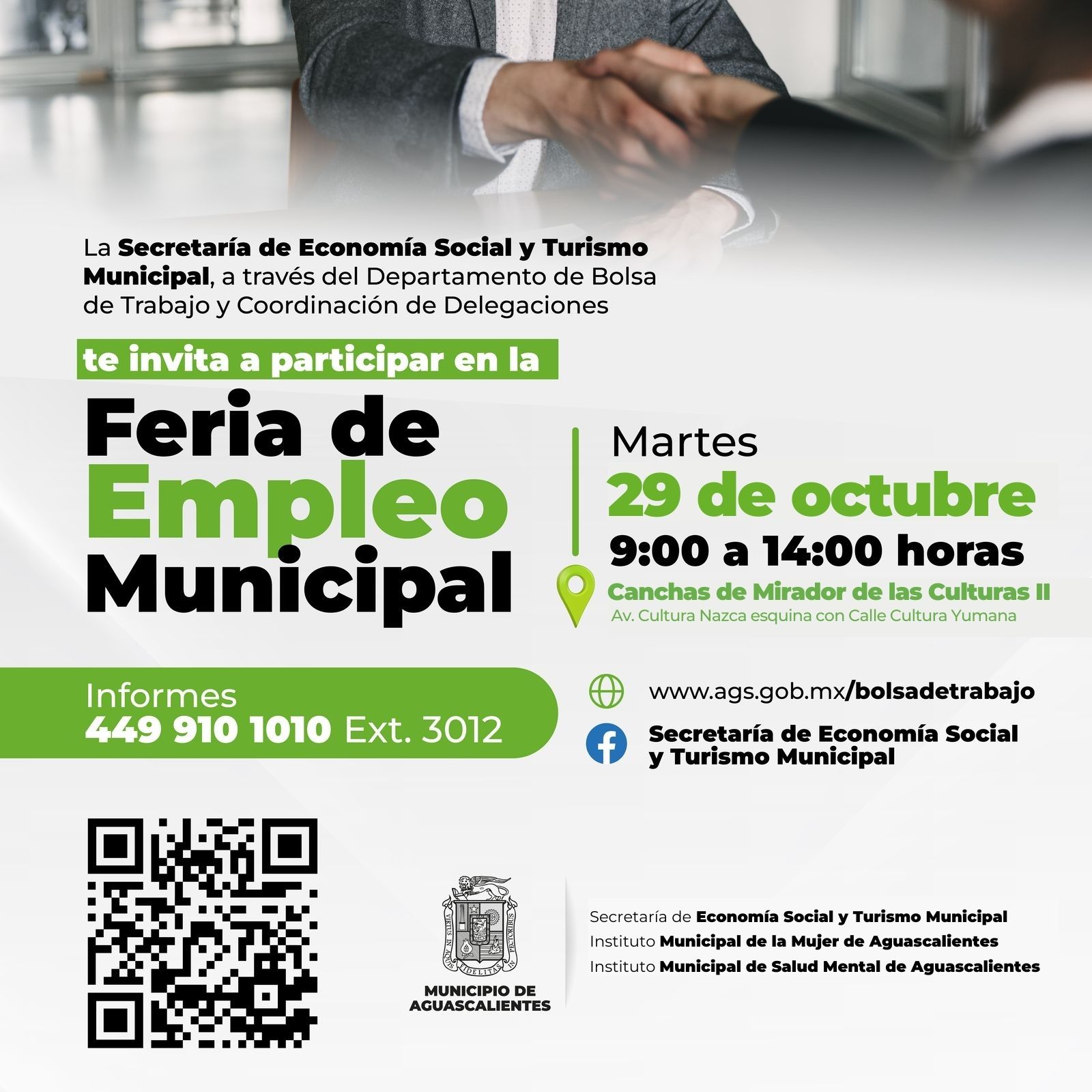 La Secretaría de Economía Social y Turismo Municipal (Setum) invita a la ciudadanía a participar en la Feria del Empleo Municipal, que se llevará a cabo el próximo martes 29 de octubre en las canchas del fraccionamiento Mirador de las Culturas II, ubicadas en Av. Cultura Nazca esquina Cultura Yumana, de 9:00 a 14:00 horas.