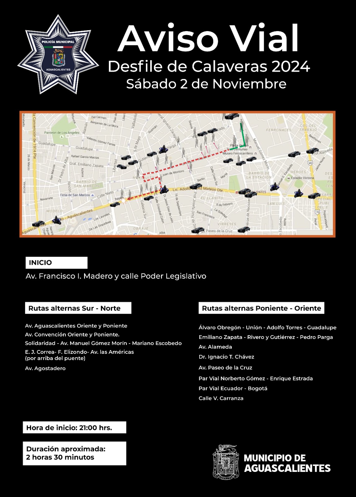 Con motivo del “Desfile de Calaveras 2024” que se desarrollará la noche de este sábado 2 de noviembre, la Secretaría de Seguridad Pública Municipal de Aguascalientes a través de la Dirección de Movilidad anuncia cierre de vialidades en las principales calles de la zona centro de la ciudad.