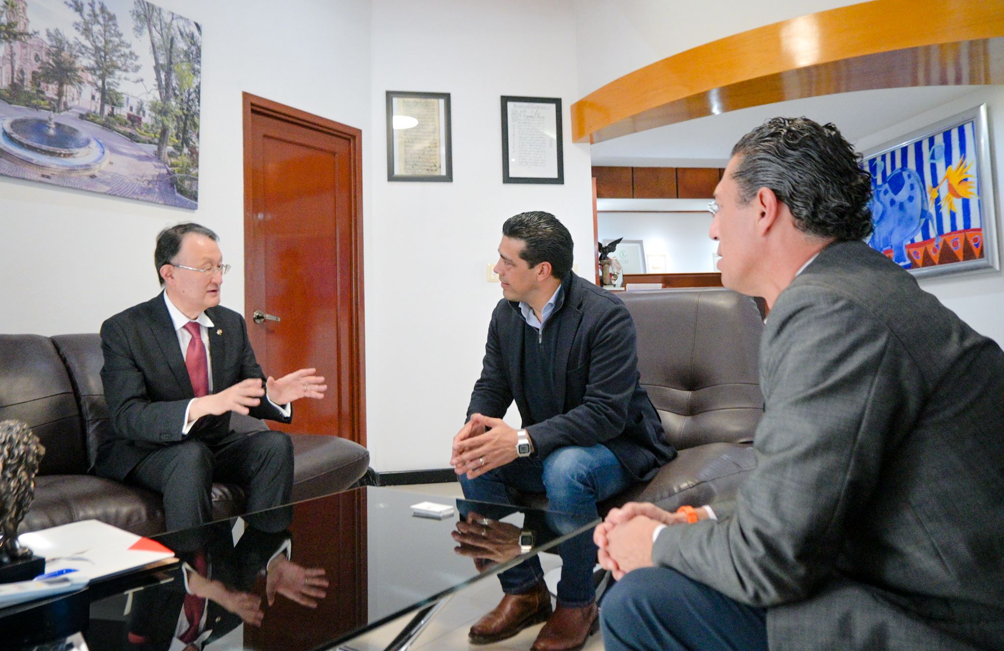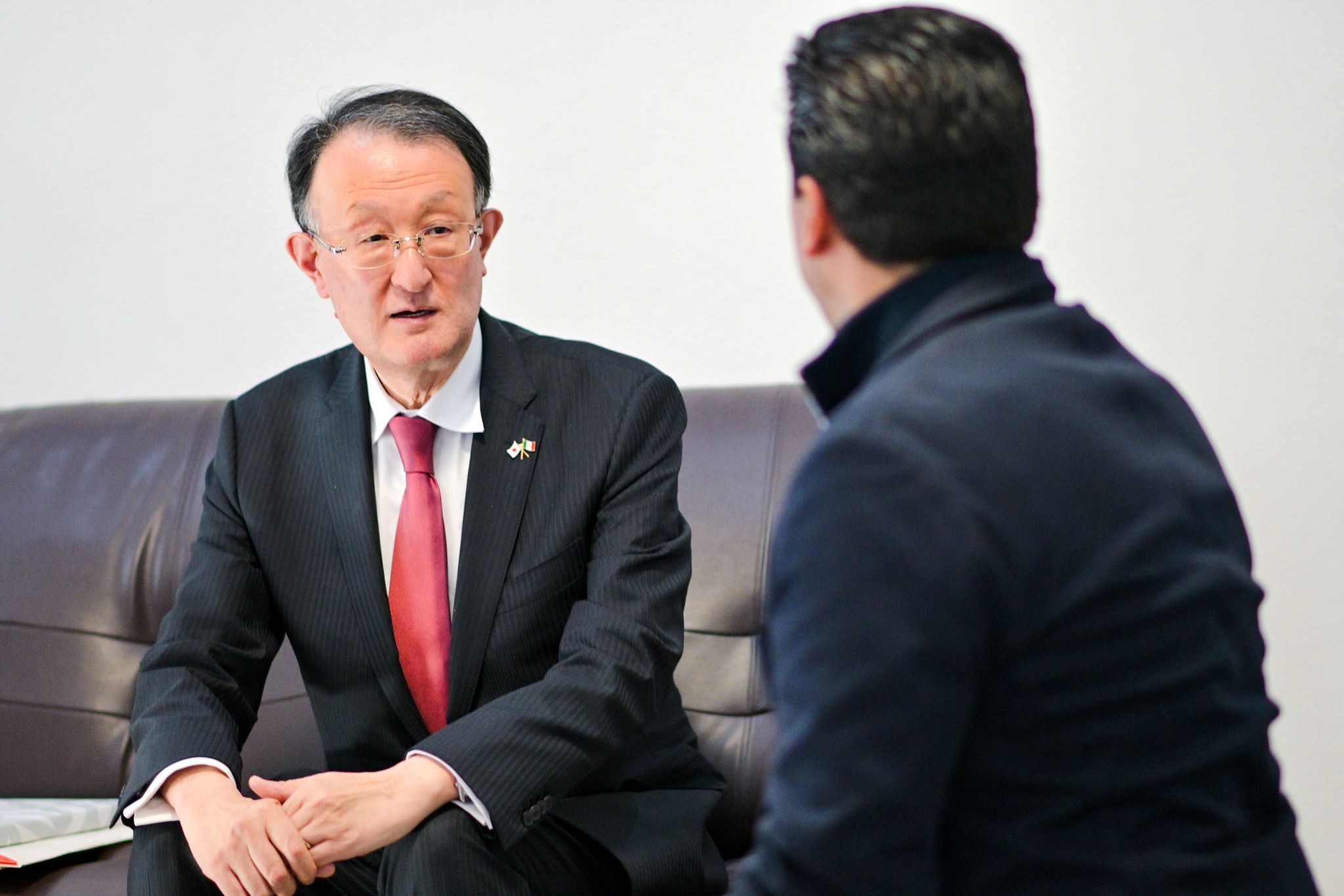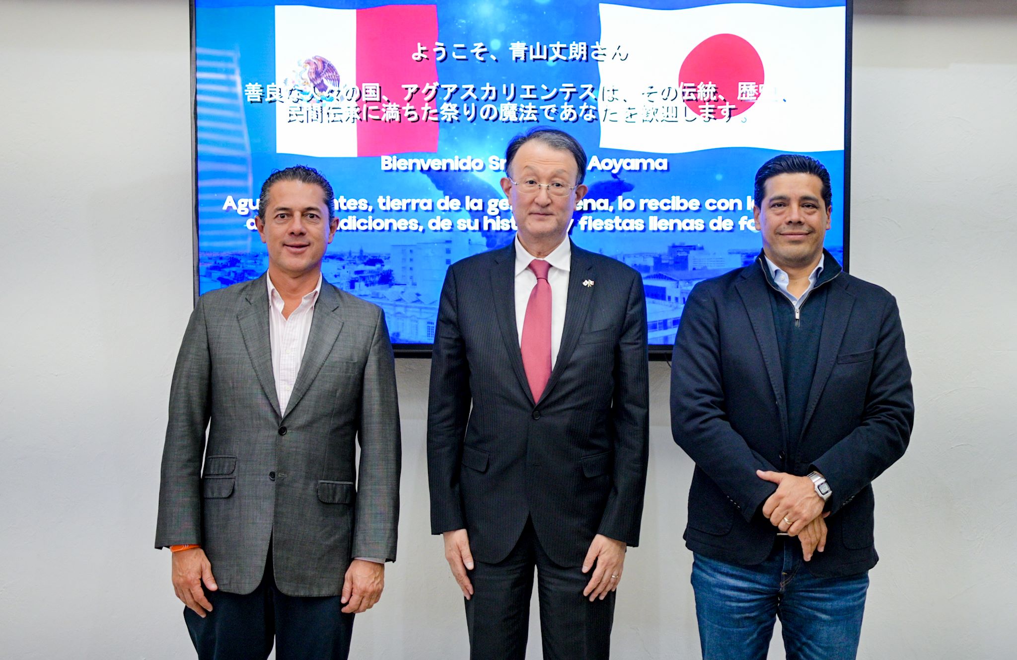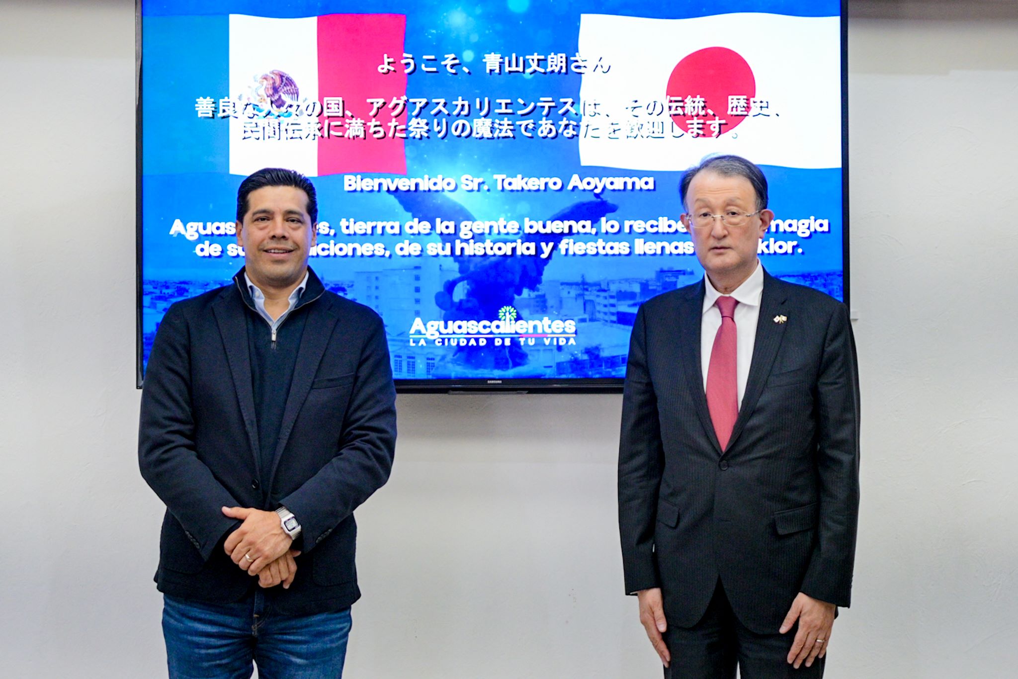 Durante el encuentro efectuado en Palacio Municipal, Leo Montañez, dio la bienvenida al diplomático, agradeció la confianza que la comunidad japonesa ha depositado en Aguascalientes y refrendó el compromiso de seguir impulsando estrategias para fortalecer las relaciones empresariales, así como la permanencia y establecimiento de nuevas compañías industriales en la entidad.