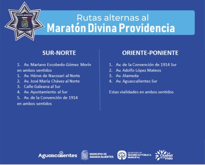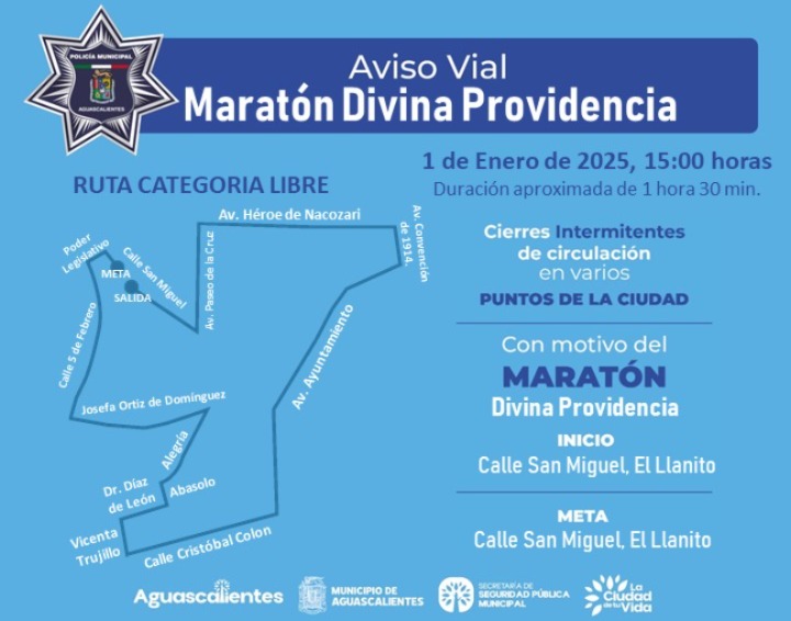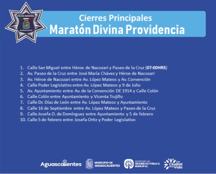El secretario de Seguridad Pública Municipal de Aguascalientes, Antonio Martínez Romo, explicó que desde las 04:00 horas de este miércoles 1 de enero de 2025, se comenzarán a retirar, de diferentes vialidades de esta colonia, los vehículos estacionados en la vía pública, para dejar libres las calles para la realización del maratón que organiza el Templo de la Divina Providencia.