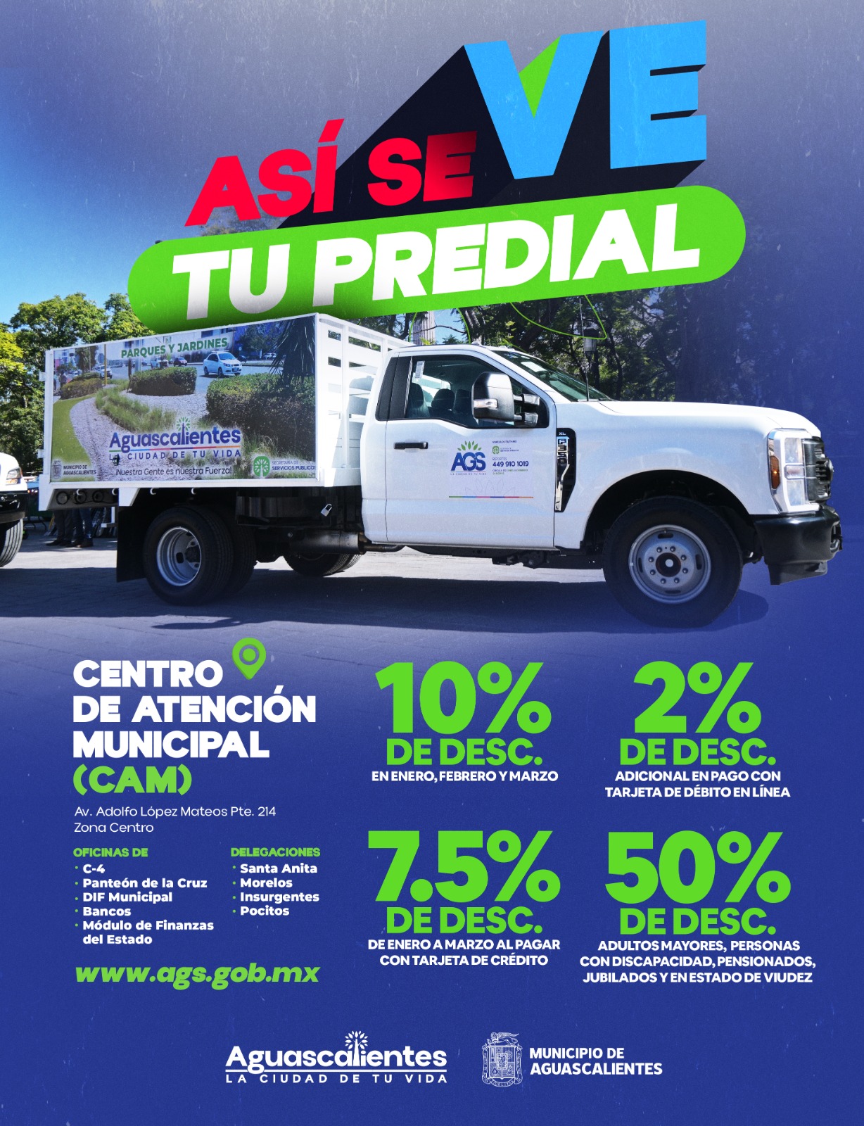 El miércoles 1 de enero de 2025 el Municipio de Aguascalientes comenzará con la campaña “Así se ve tu predial”, a través de la cual las personas obtendrán 10 por ciento de descuento por pronto pago durante enero, febrero y marzo.