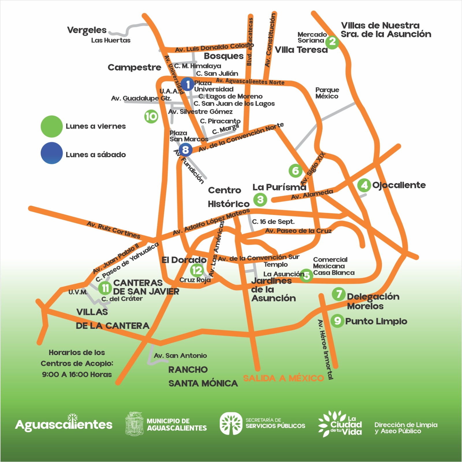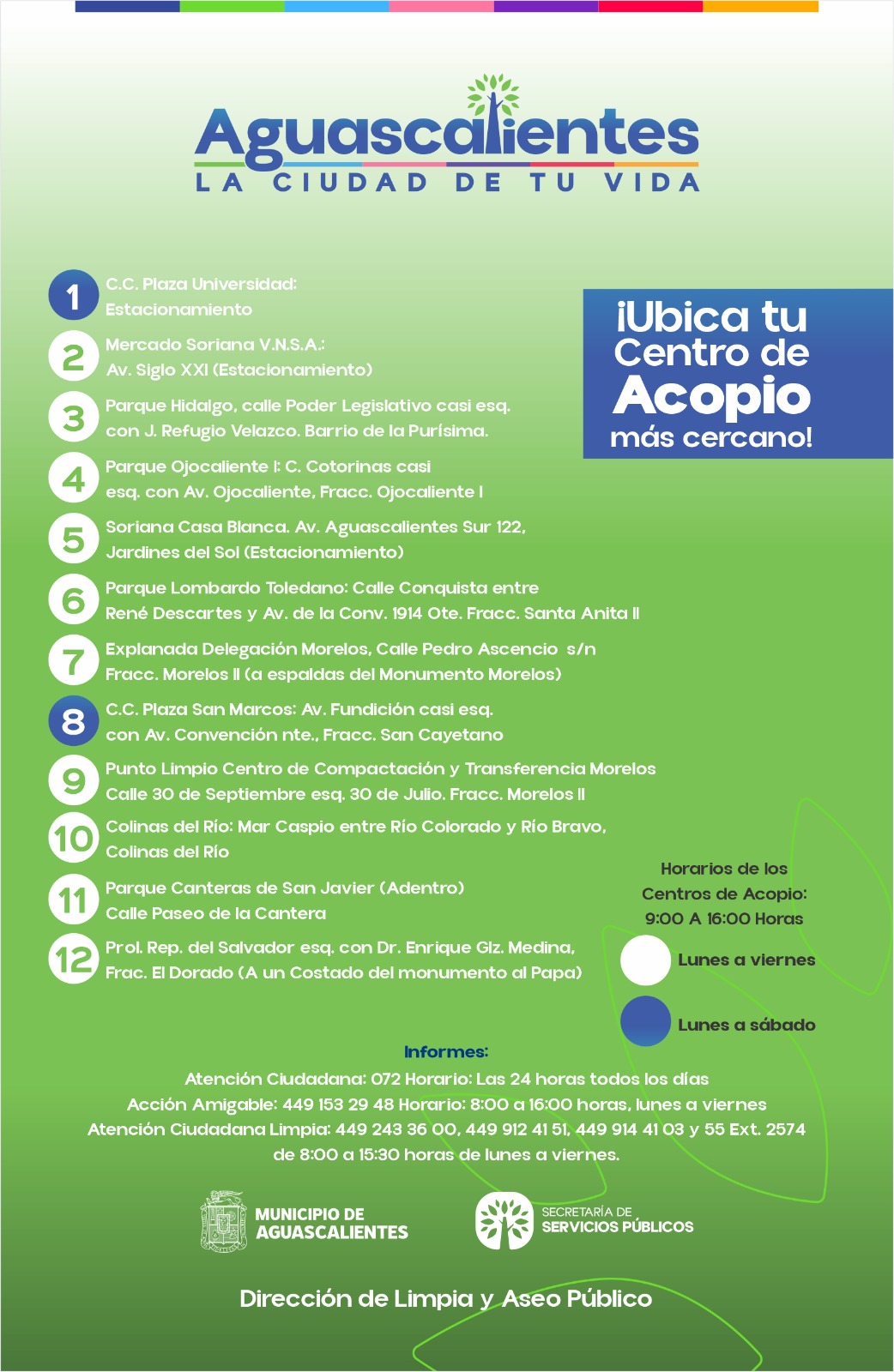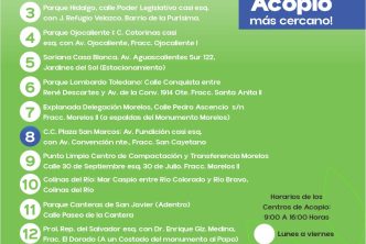 La ciudadanía tiene a su disposición 12 centros de acopio en diferentes puntos de la capital, en los estacionamientos de los centros comerciales Soriana Casa Blanca, Soriana Villas de Nuestra Señora de la Asunción, en los parques Miguel Hidalgo, Ojocaliente I, Lombardo Toledano, Canteras de San Javier, explanada de la delegación Morelos y Punto Limpio Morelos II, a un costado del monumento al Papa y en Colinas del Río, todos con horario de atención de 9:00 a 16:00 horas, de lunes a viernes