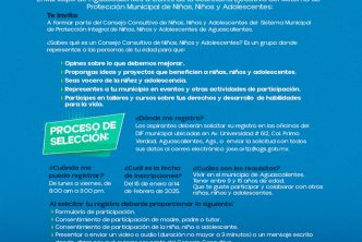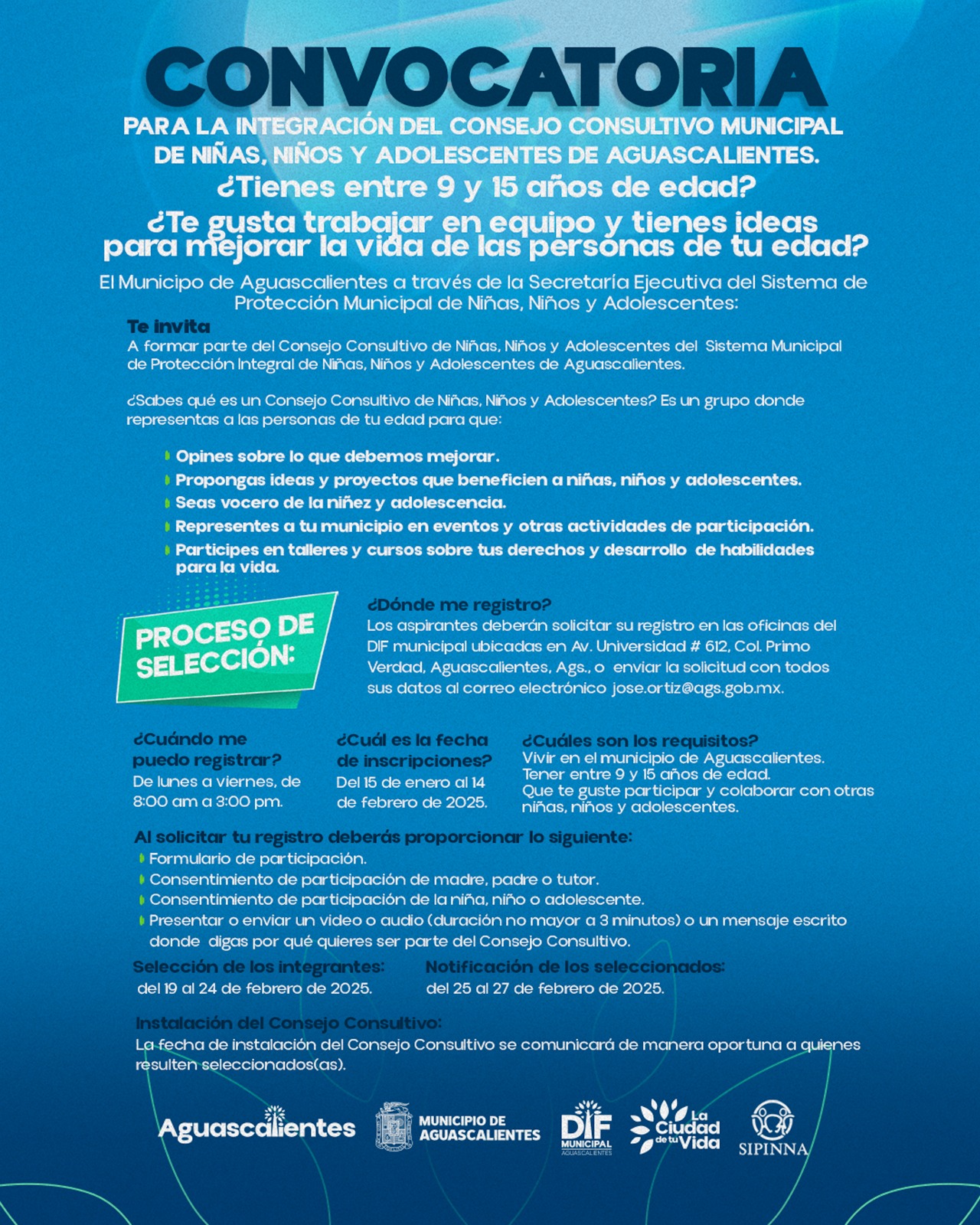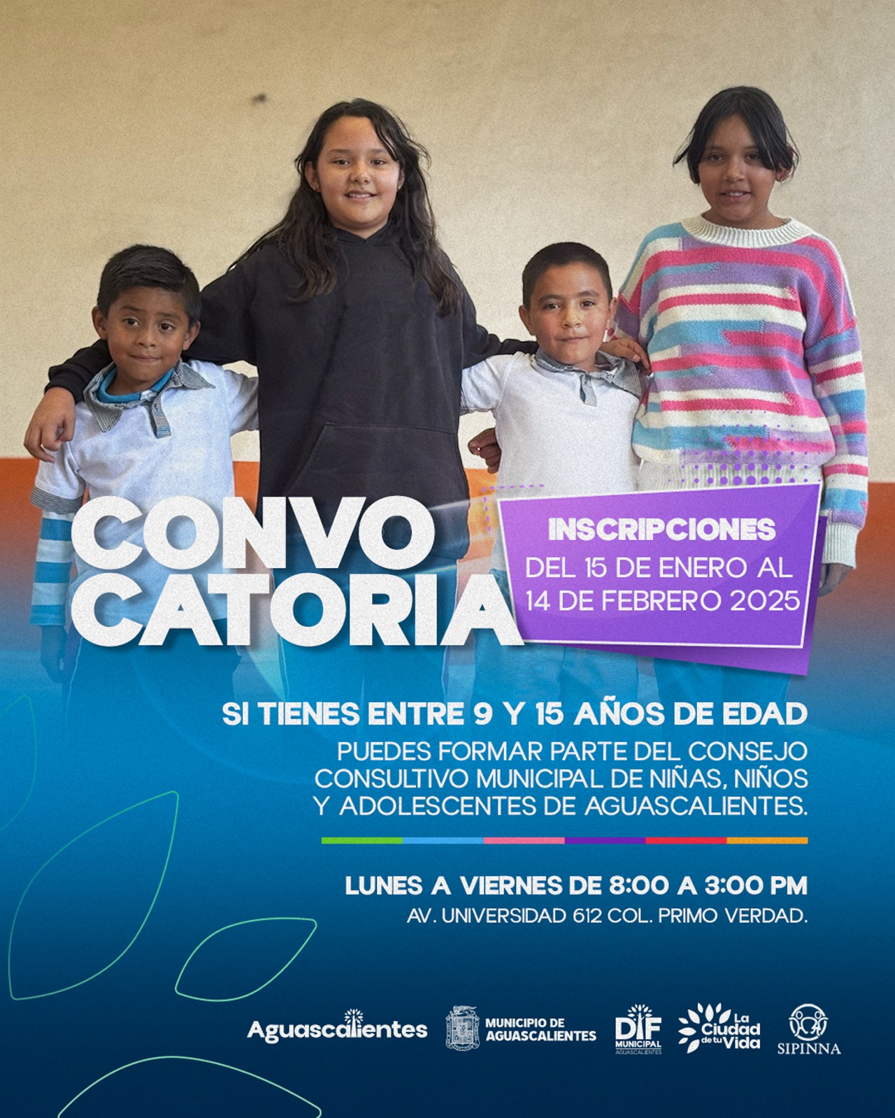El Municipio de Aguascalientes, a través de la Secretaría Ejecutiva del Sistema de Protección Municipal de Niñas, Niños y Adolescentes (SIPINNA), convoca a los menores de entre 9 y 15 años de edad para formar parte del Consejo Consultivo de SIPINNA, el cual es un espacio donde podrán representar a las infancias, proponer ideas o proyectos en beneficio de la niñez y juventud de Aguascalientes, así como representar al municipio en diversos eventos, además de participar en talleres y cursos sobre sus derechos y desarrollo de habilidades para la vida.