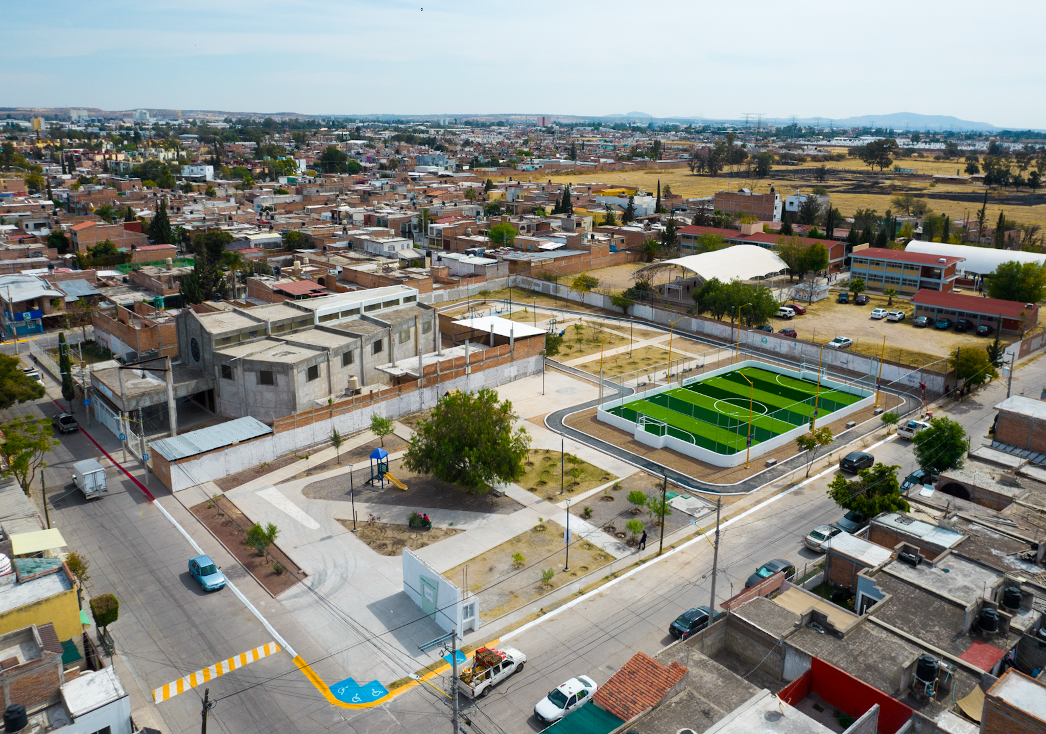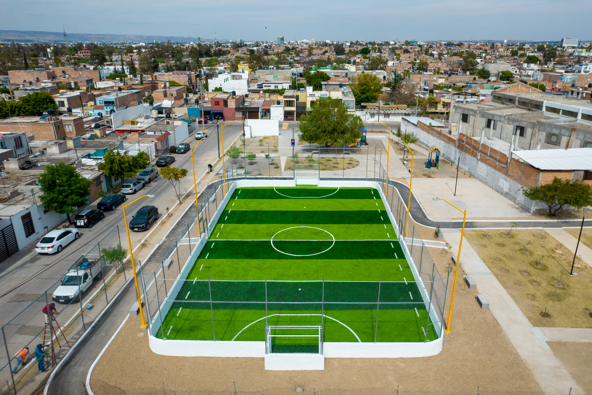 En el parque Villas del Oeste ubicado entre la Calle Jorge Negrete y Calle Pedro Vargas, se realizó la construcción de una cancha de pasto sintético con muro perimetral, instalación de malla ciclónica, así como la rehabilitación de trotapista e instalación de luminarias, lo que brindará seguridad y mejor visibilidad a los usuarios durante las actividades deportivas y recreativas.
