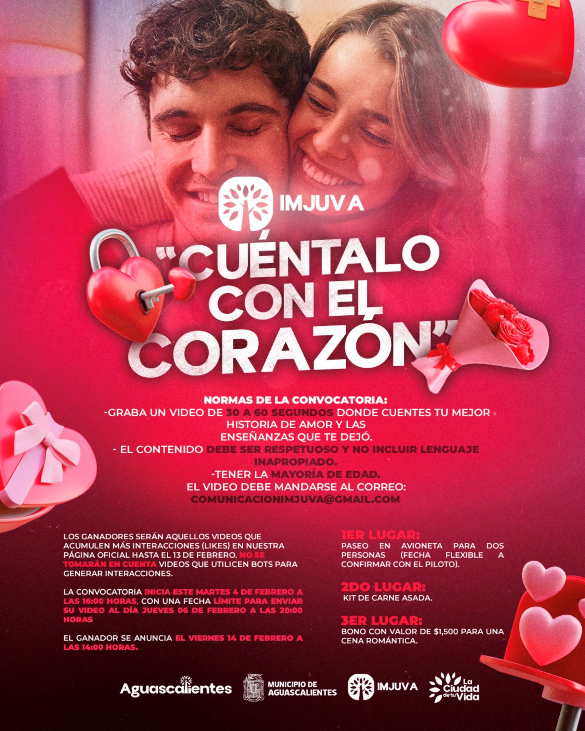 En el marco del Mes del Amor y la Amistad, el Instituto Municipal de la Juventud de Aguascalientes (Imjuva) invita a participar en la dinámica “Cuéntalo con el Corazón”, una oportunidad para compartir historias y experiencias de amor.