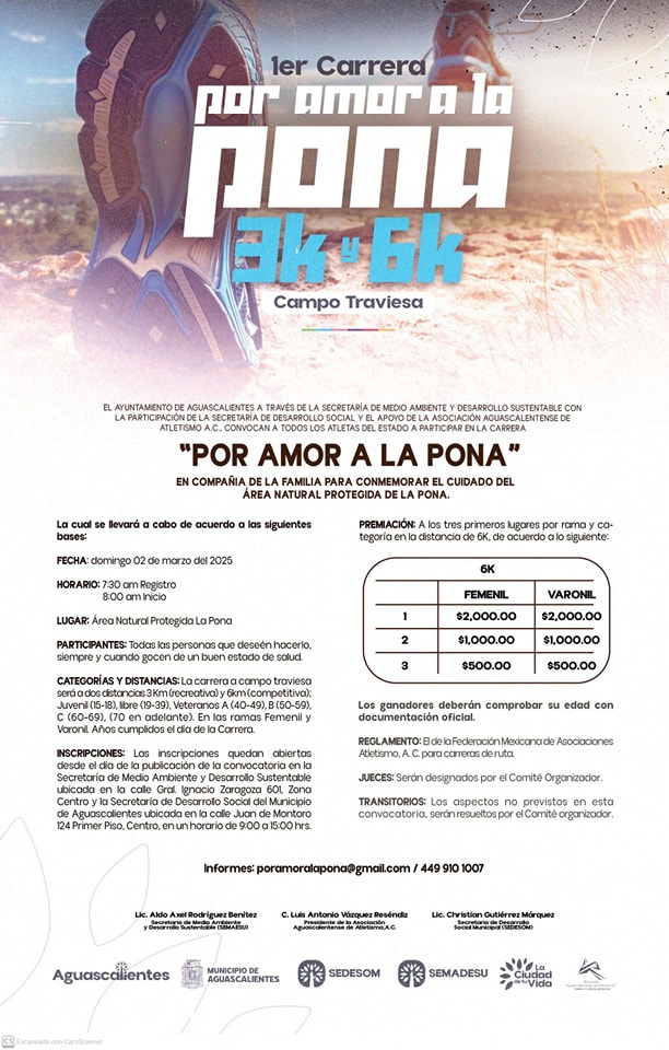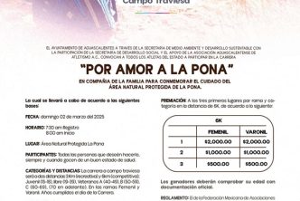 El Municipio de Aguascalientes invita a la ciudadanía a participar en la 1era carrera «Por Amor a La Pona», la cual se llevará a cabo el domingo 2 de marzo a las 8:00 horas en el Área Natural Protegida Municipal.