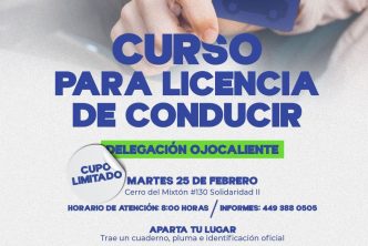 El Municipio de Aguascalientes invita a la ciudadanía que desee tramitar su licencia de manejo por primera vez a tomar el curso de educación vial que se impartirá gratuitamente en la Delegación Ojocaliente el próximo martes 25 de febrero.