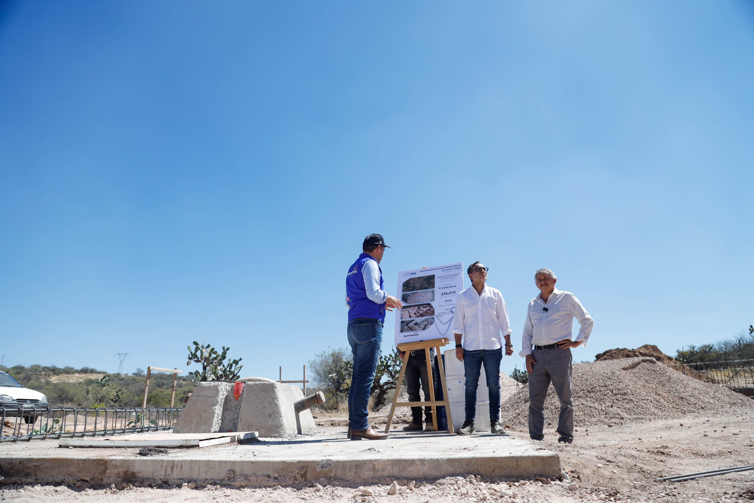 Posteriormente, la comitiva se trasladó al pozo P-104B, El Conejal 2, donde se realizan trabajos para mejorar la disponibilidad de agua potable con una inversión de 8.9 millones de pesos, así lo dió a conocer Mauricio Regalado, director del área operativa del Modelo Integral de Aguas de Aguascalientes (MIAA).