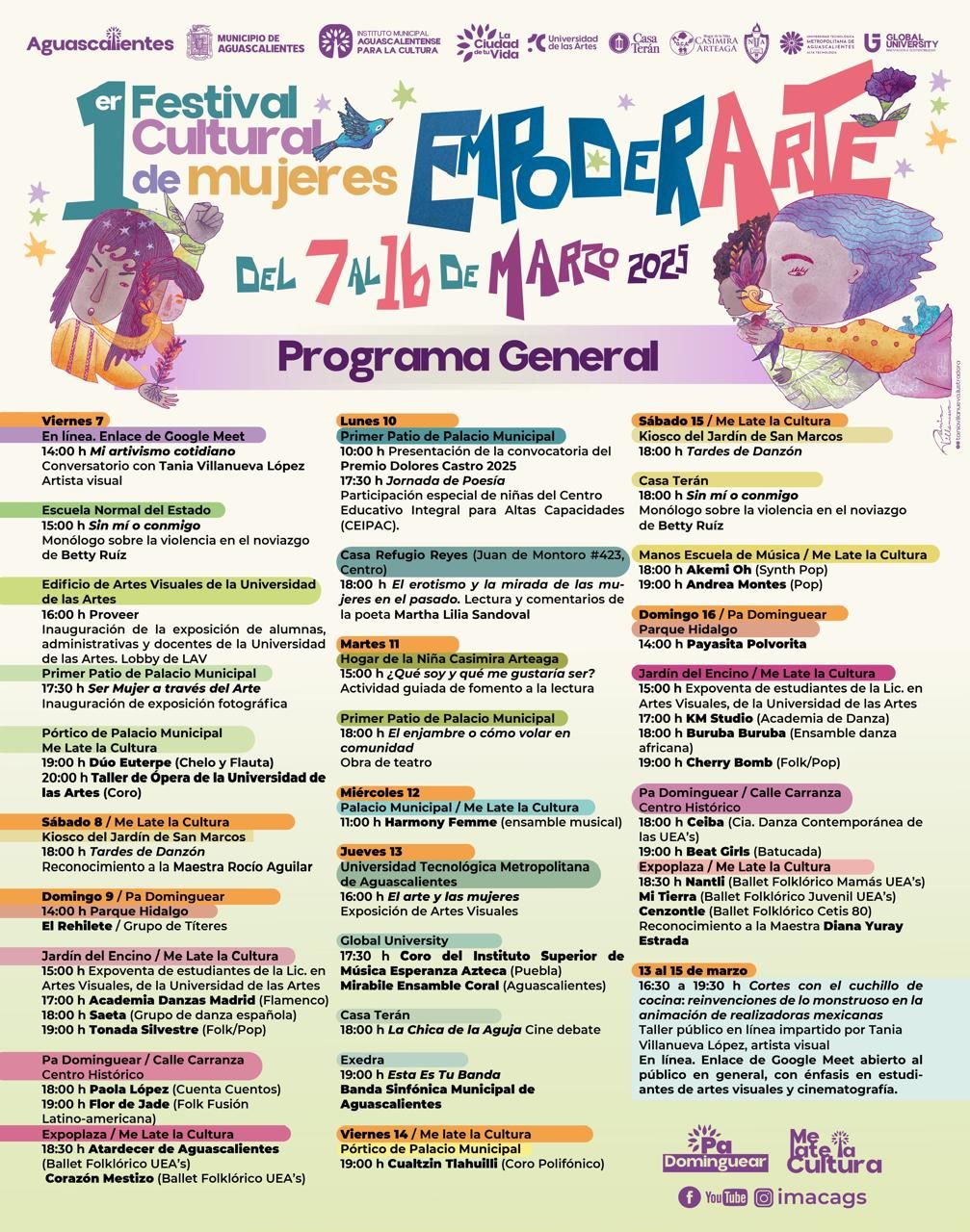 Empoderarte se llevará a cabo del 7 al 16 de marzo en diversas sedes y espacios públicos. Todas las actividades son completamente gratuitas y para todo público. Pueden consultar el programa completo del festival en las redes sociales del IMAC y el Municipio de Aguascalientes.
