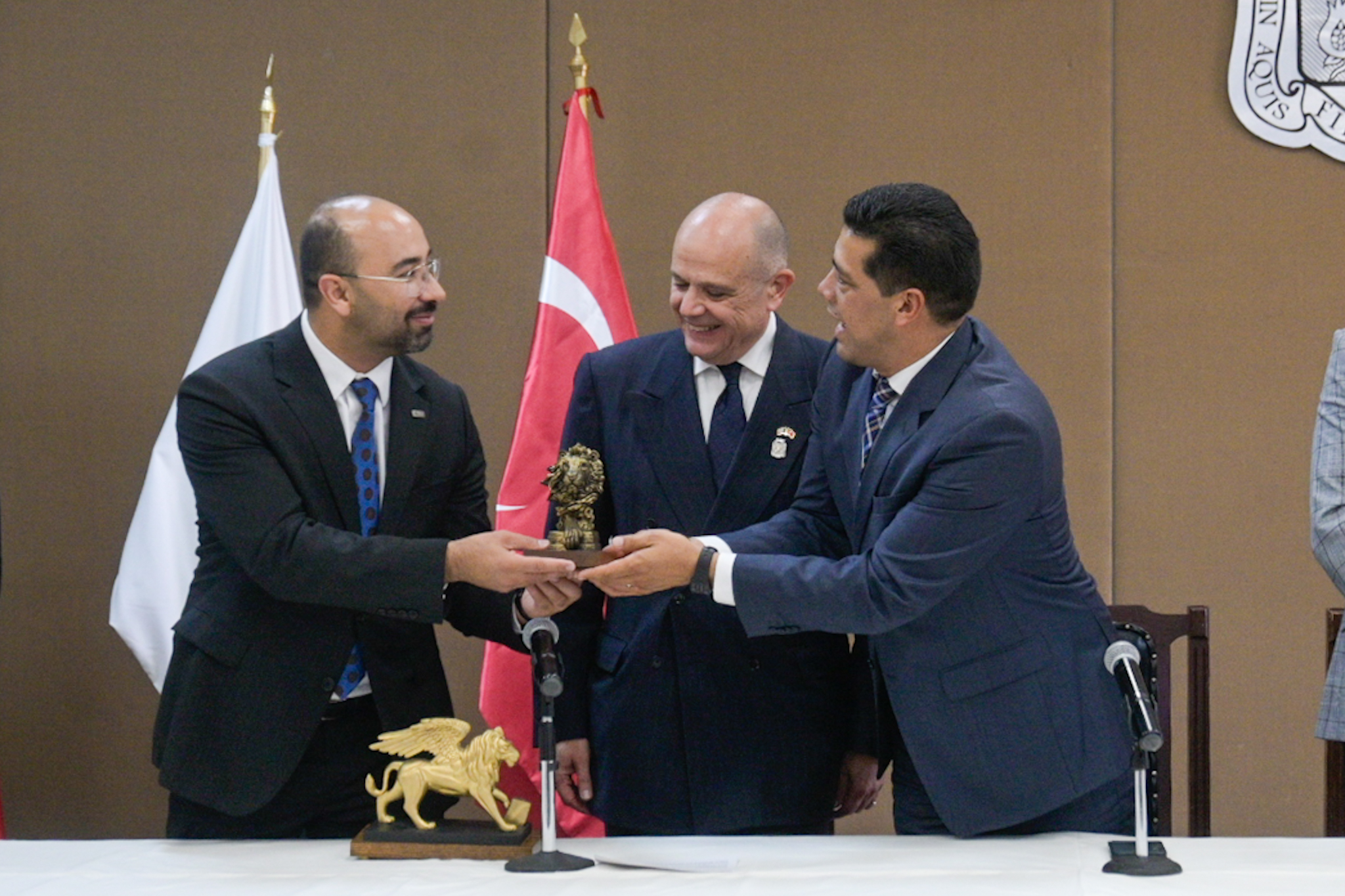 La tarde de este martes, el presidente municipal, Leo Montañez hizo entrega del reconocimiento “Visitante Distinguido” y del León de la heráldica de Aguascalientes que es equivalente a recibir las llaves de la ciudad, a Murat Salim Esnelli, embajador de la República de Turquía en México.