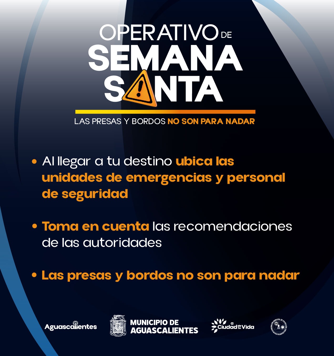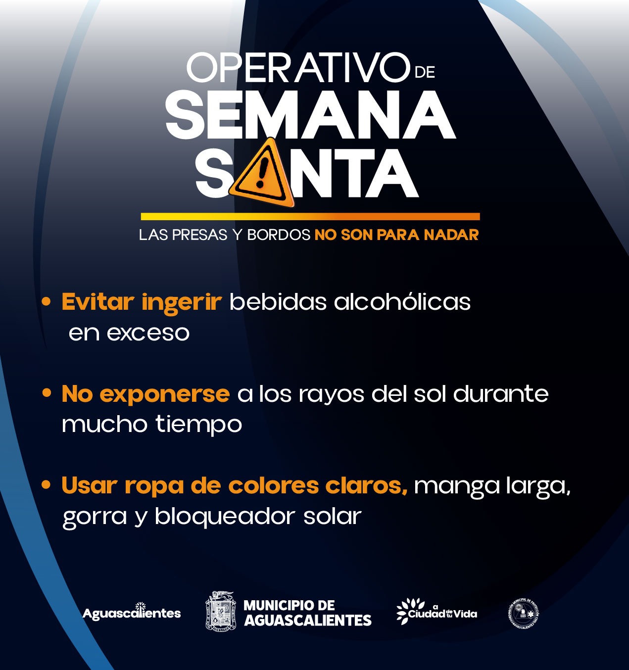 Vázquez Vega estableció que el porcentaje de agua de las presas y bordos restantes, actualmente se encuentran con un bajo nivel de agua, sin embargo, no dejan de ser peligrosas y engañosas, siendo estas zonas irregulares y pantanosas, por ello dio a conocer las siguientes medidas de seguridad: