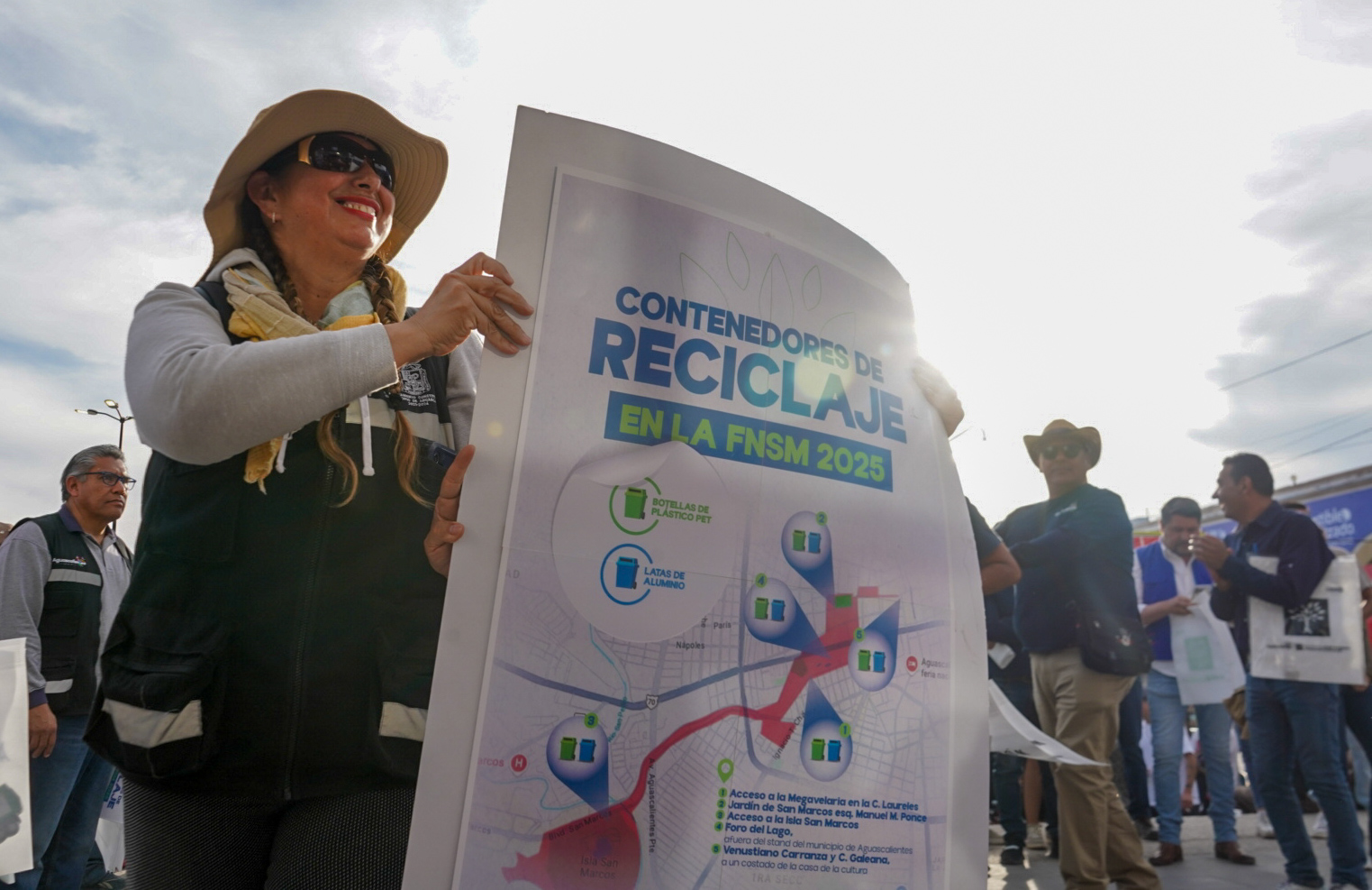 En el perímetro de la Feria Nacional de San Marcos se habilitaron cinco puntos estratégicos para la recolección de residuos, donde los visitantes podrán depositar materiales PET en botes verdes y desechos de aluminio en botes azules.
