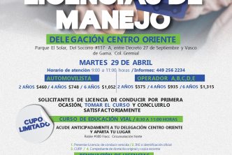 Además de la renovación, también se impartirá el curso de manejo para los solicitantes de licencia de primera vez, por lo cual, deberán presentarse a las 8:30 horas con identificación oficial, CURP, comprobante de domicilio y con cuaderno, pluma y lápiz, y aprobar satisfactoriamente el curso, a fin de continuar con el debido trámite de expedición de la licencia.