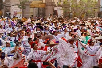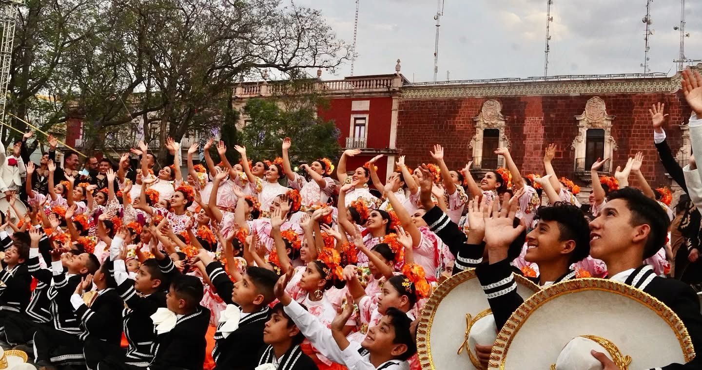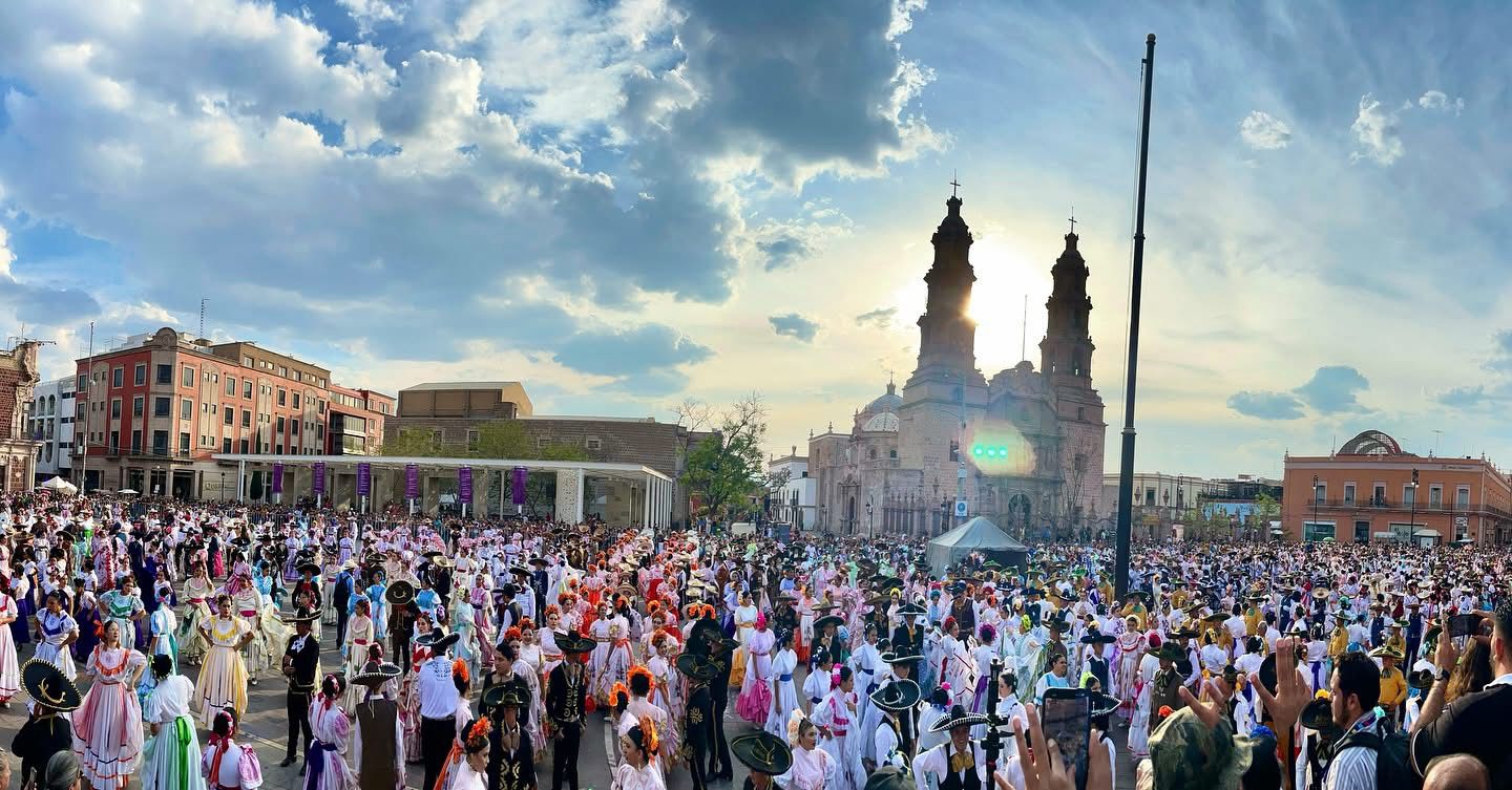 Más de mil 700 bailarines de Aguascalientes, Jalisco, Oaxaca, Chihuahua, Zacatecas y Nuevo León ejecutaron la coreografía Pelea de Gallos Monumental en Plaza de la Patria para rendir homenaje a la disciplina artística de la danza.