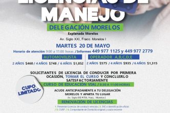 El Municipio de Aguascalientes informó que se llevará a cabo una nueva jornada de renovación de licencias de manejo el próximo martes 20 de mayo; esta se realizará en la Explanada del Monumento a Morelos en el Fraccionamiento Morelos I, de las 9:00 a las 11:00 horas.