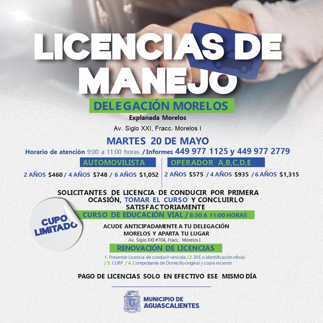 El Municipio de Aguascalientes informó que se llevará a cabo una nueva jornada de renovación de licencias de manejo el próximo martes 20 de mayo; esta se realizará en la Explanada del Monumento a Morelos en el Fraccionamiento Morelos I, de las 9:00 a las 11:00 horas.