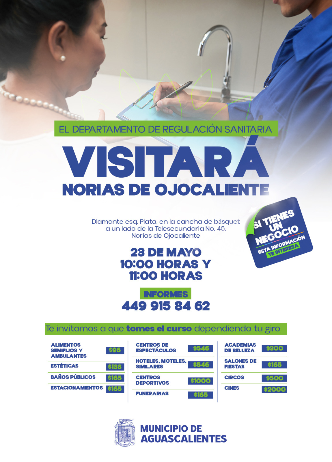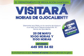 La Coordinación General de Salud del Municipio de Aguascalientes da a conocer que el 23 de mayo de 2025, el Departamento de Regulación Sanitaria visitará Norias de Ojocaliente, con el objetivo de impartir cursos a propietarios y responsables de negocios o establecimientos comerciales.