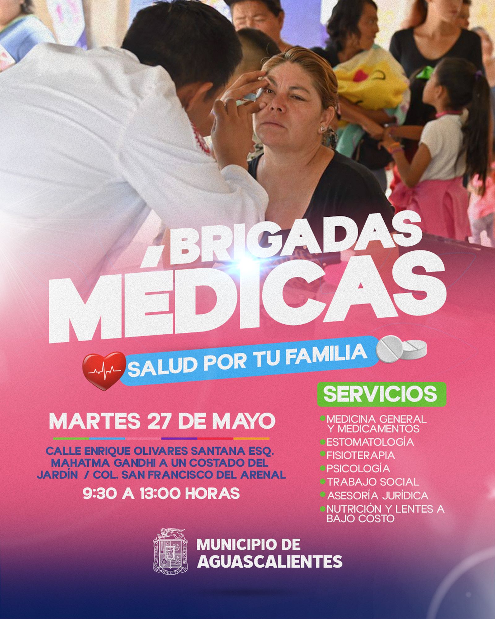 Martes 27 de mayo: Calle Enrique Olivares Santana esquina Mahatma Gandhi, a un costado del jardín. Colonia San Francisco del Arenal, de 9:30 a 13:00 horas.