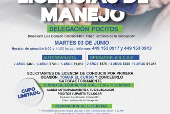 El Municipio de Aguascalientes da a conocer que la primera jornada de renovación de licencias de manejo del mes de junio se llevará a cabo en las instalaciones de la Delegación Pocitos este martes 03 de junio, de las 9:00 a las 11:00 horas.