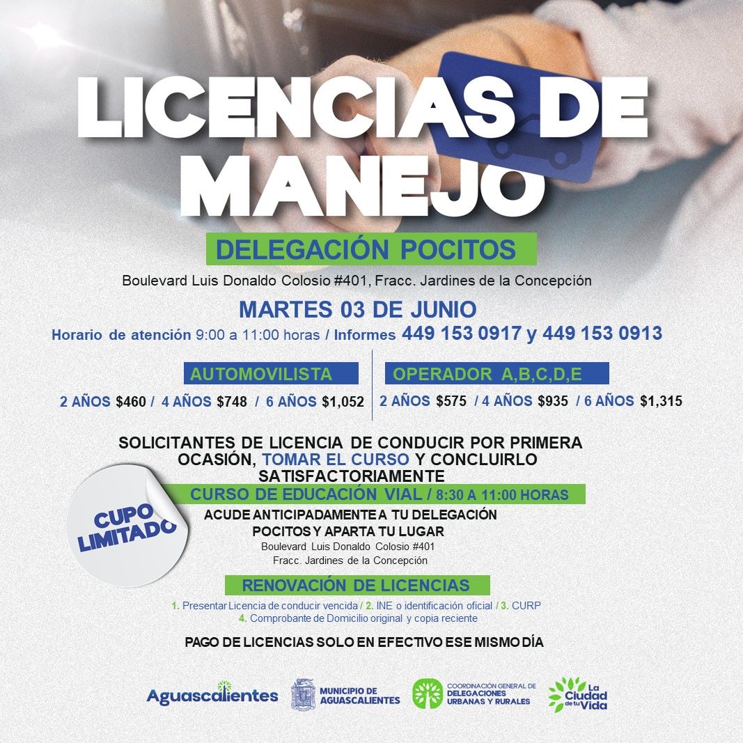 El Municipio de Aguascalientes da a conocer que la primera jornada de renovación de licencias de manejo del mes de junio se llevará a cabo en las instalaciones de la Delegación Pocitos este martes 03 de junio, de las 9:00 a las 11:00 horas.