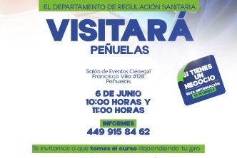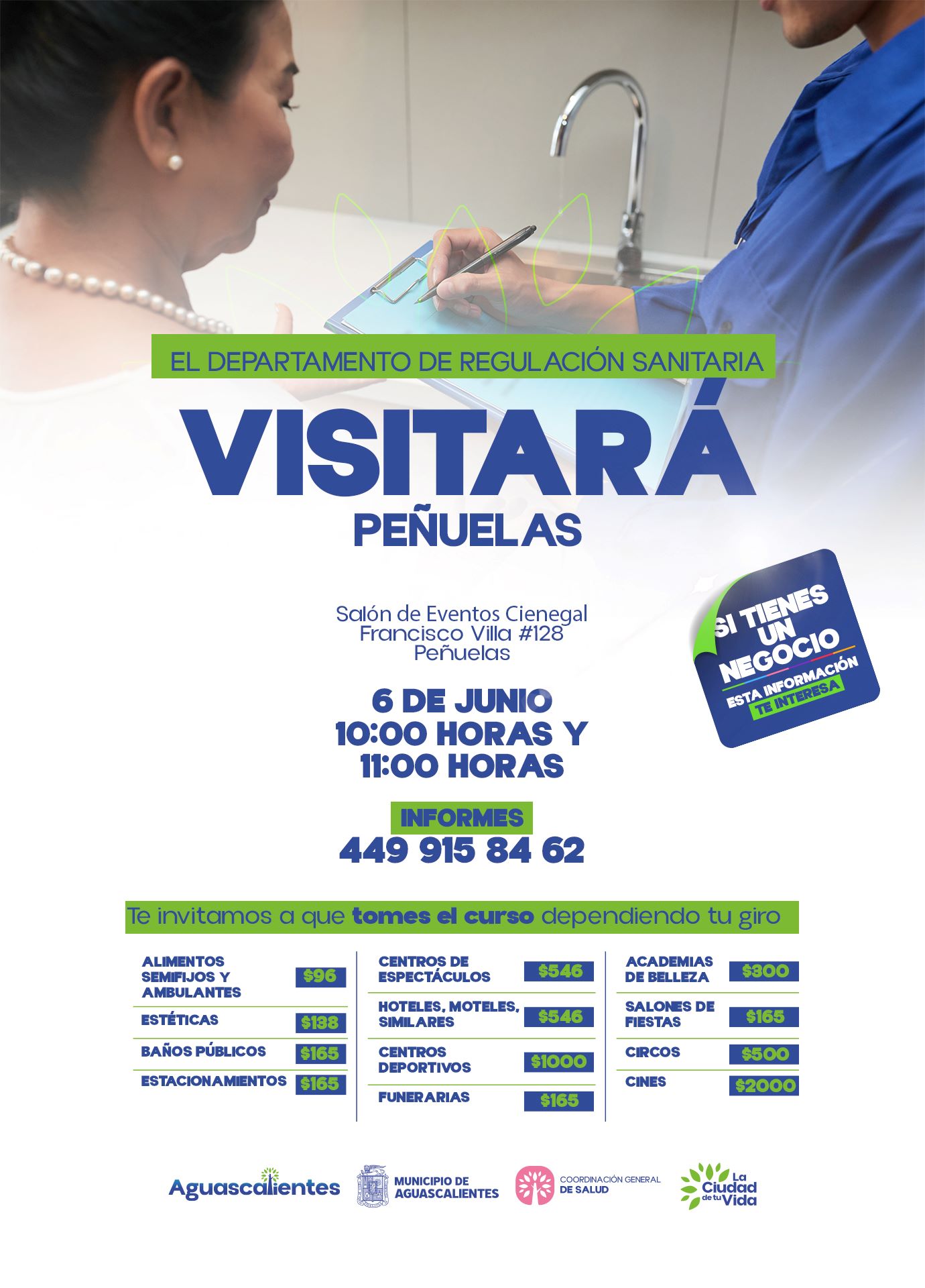 La Coordinación General de Salud del Municipio de Aguascalientes informa que este viernes 6 de junio el Departamento de Regulación Sanitaria visitará Peñuelas, con la finalidad de impartir cursos de manejo de alimentos y otros establecimientos como estéticas.