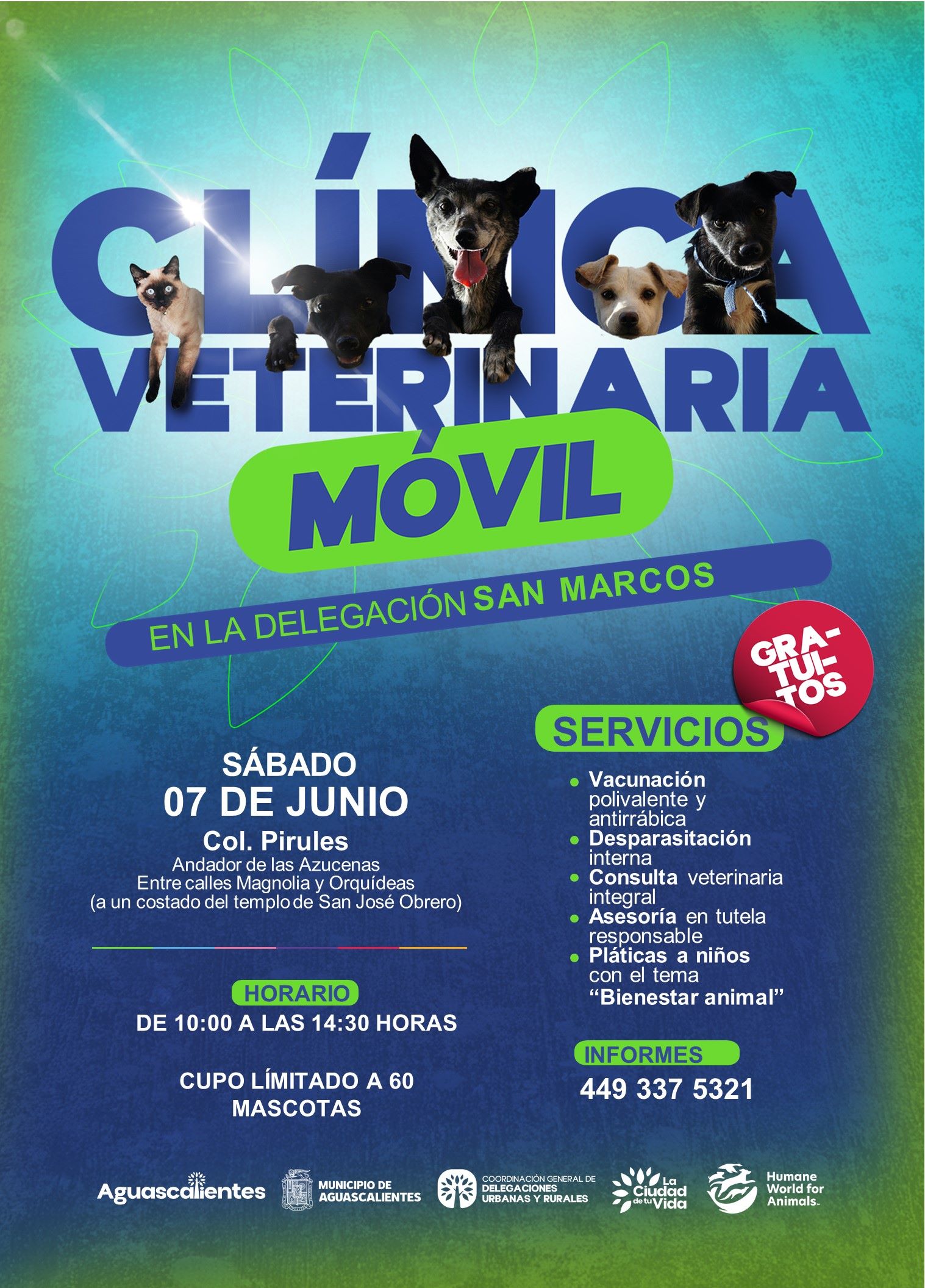 Con el objetivo de seguir brindando servicios veterinarios gratuitos, la Coordinación General de Delegaciones Urbanas y Rurales del Municipio de Aguascalientes, da a conocer que este fin de semana se llevarán a cabo dos jornadas de la Clínica Veterinaria Móvil.