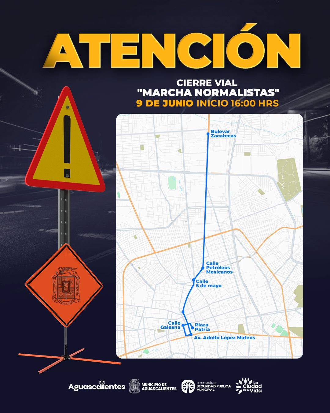 La Secretaría de Seguridad Pública Municipal de Aguascalientes, a través de la Dirección de Movilidad, informa que el próximo lunes 9 de junio se llevará a cabo un operativo vial con motivo de la marcha organizada por la Escuela Normal Superior Rural “Justo Sierra Méndez”, de Cañada Honda.