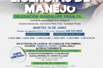 El próximo martes 10 de junio la Unidad Móvil de Renovación de Licencias de Manejo de la Secretaría de Seguridad Pública Estatal estará brindando el servicio en la Delegación Guadalupe Peralta para los ciudadanos que desean renovar su licencia de automovilista, motociclista y de operador tipo A, B, C, D y E.