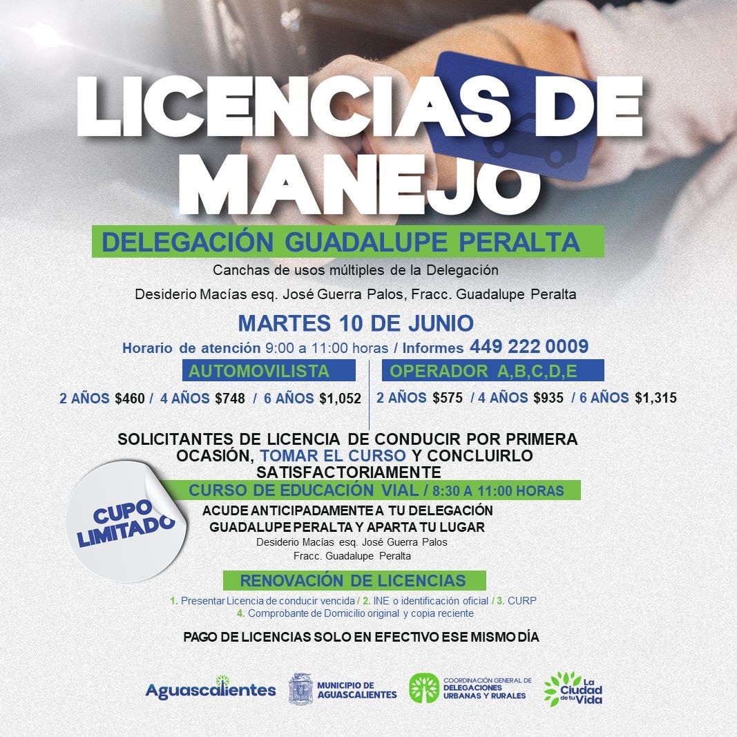 El próximo martes 10 de junio la Unidad Móvil de Renovación de Licencias de Manejo de la Secretaría de Seguridad Pública Estatal estará brindando el servicio en la Delegación Guadalupe Peralta para los ciudadanos que desean renovar su licencia de automovilista, motociclista y de operador tipo A, B, C, D y E.