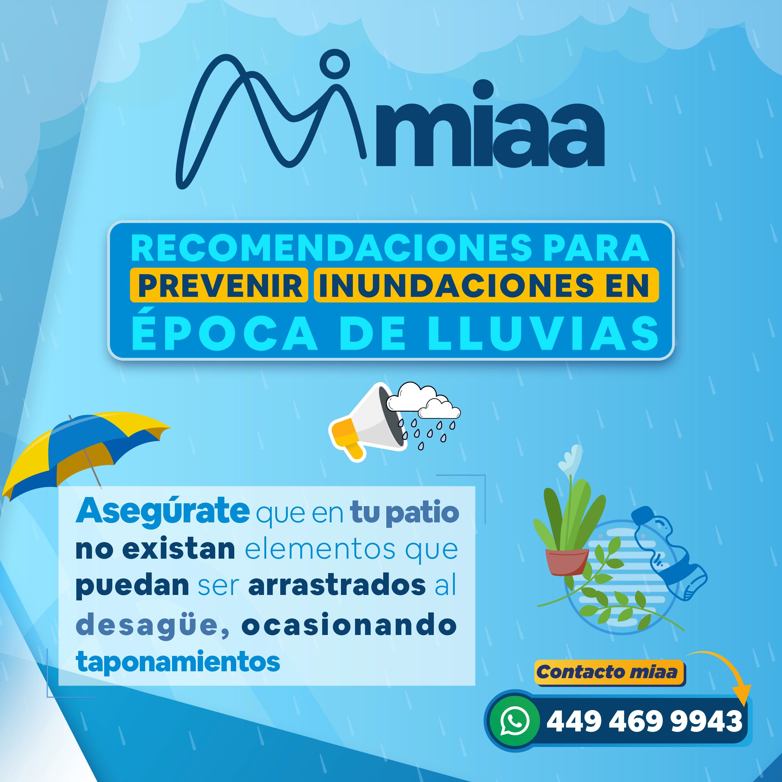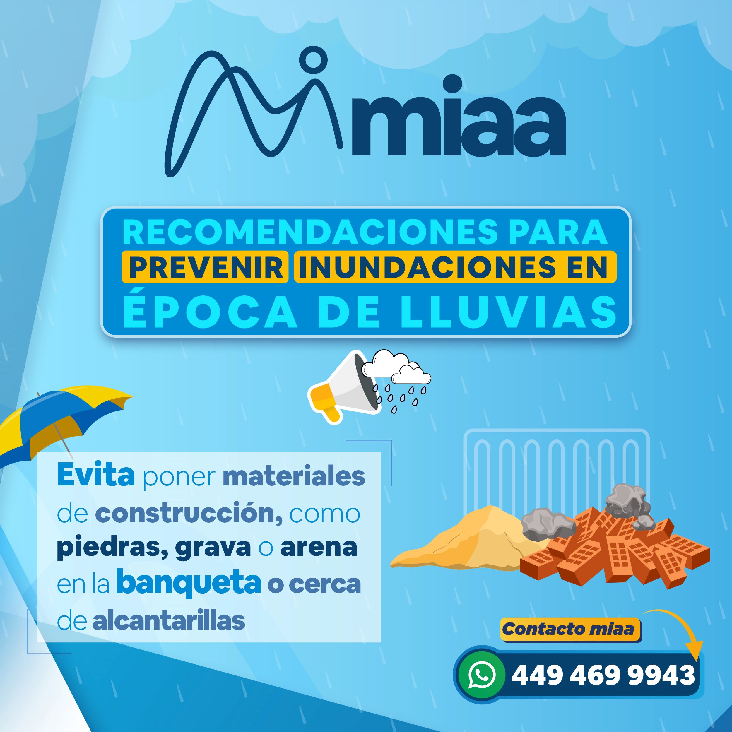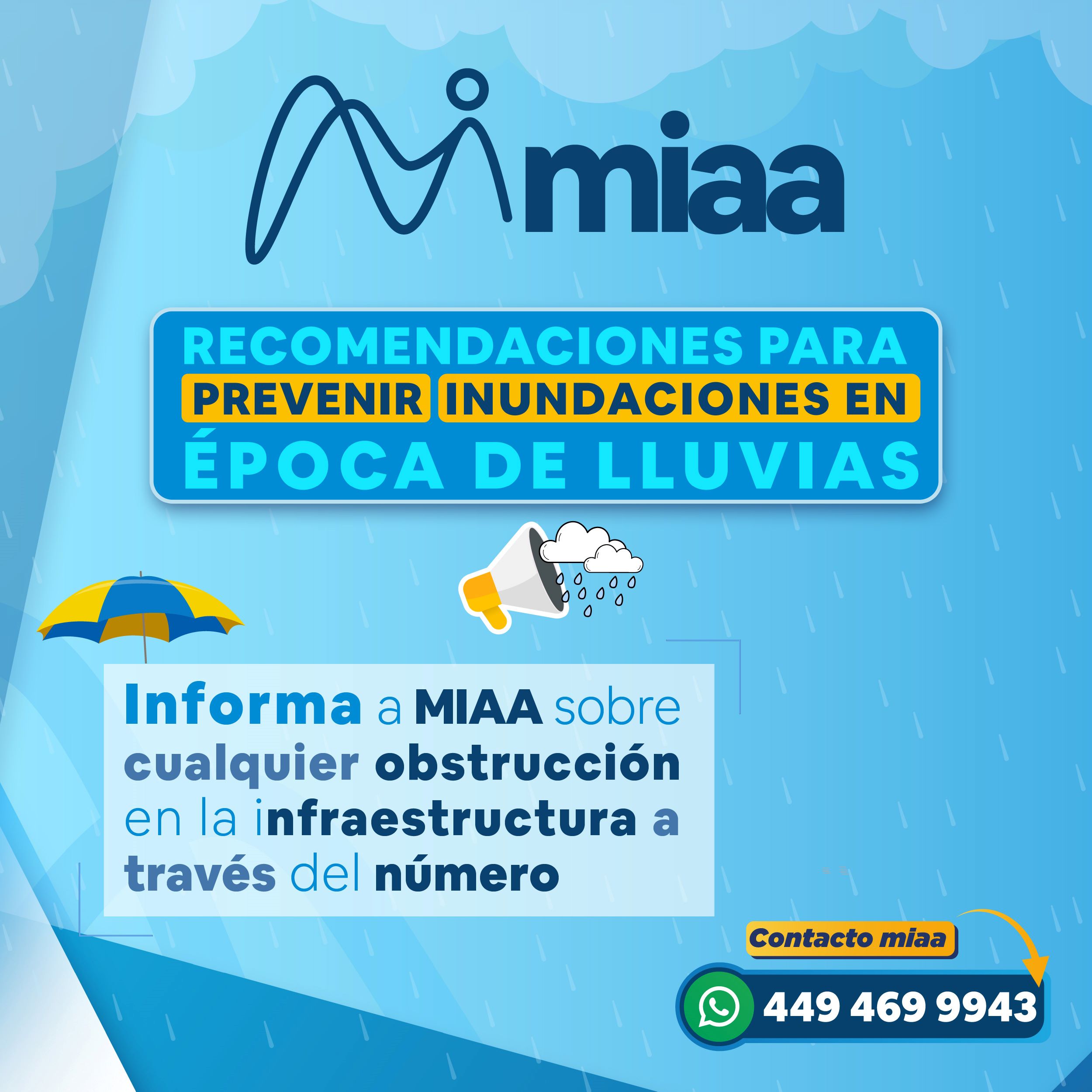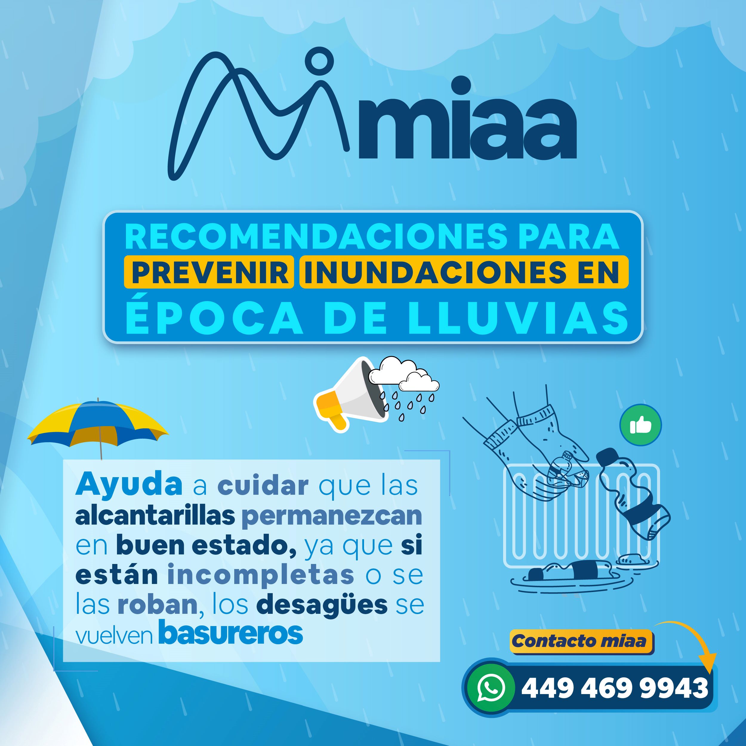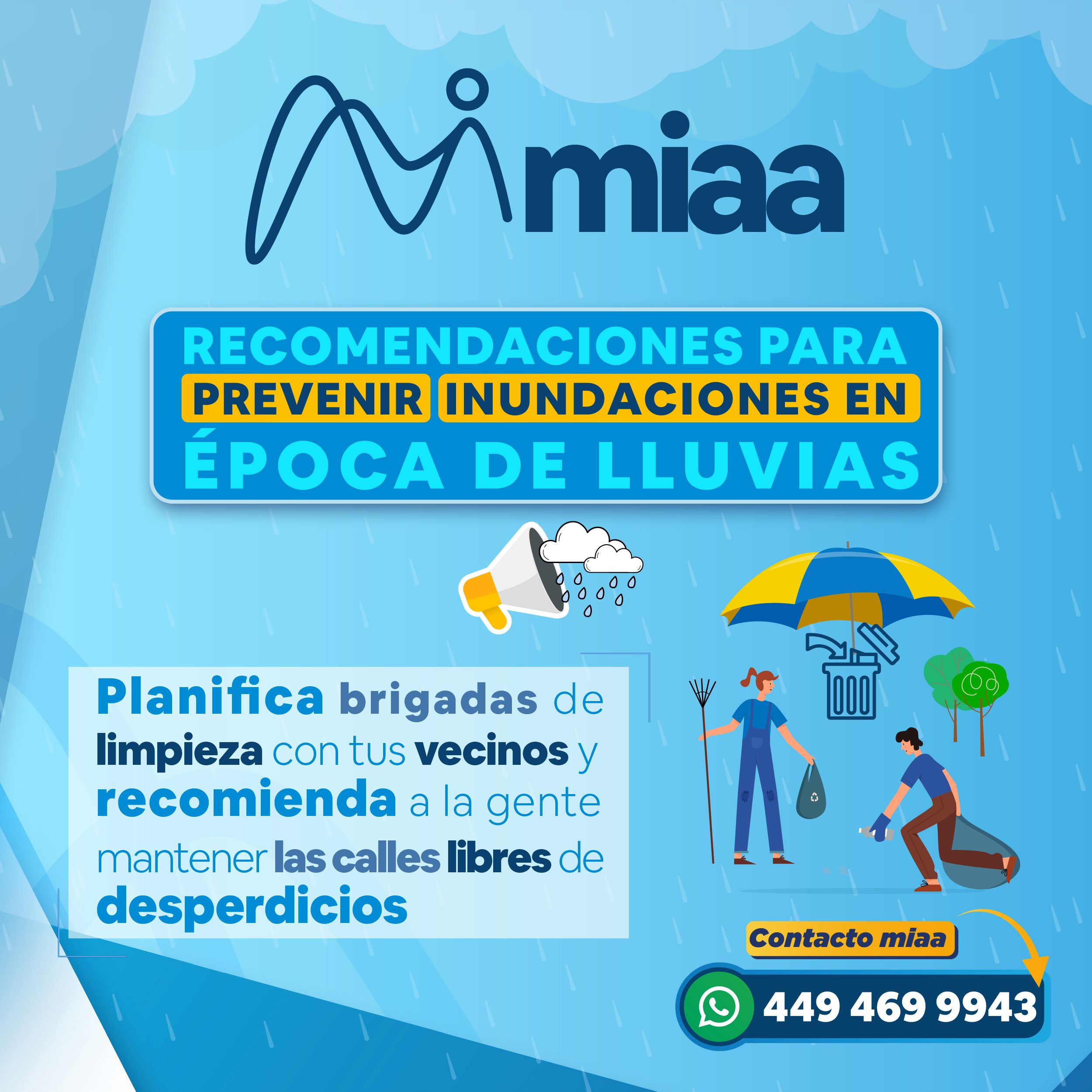 • Reportar a MIAA al WhatsApp 449 469 99 43 cualquier tipo de obstrucción en bocas de tormenta, desagües y alcantarillas, para que se
