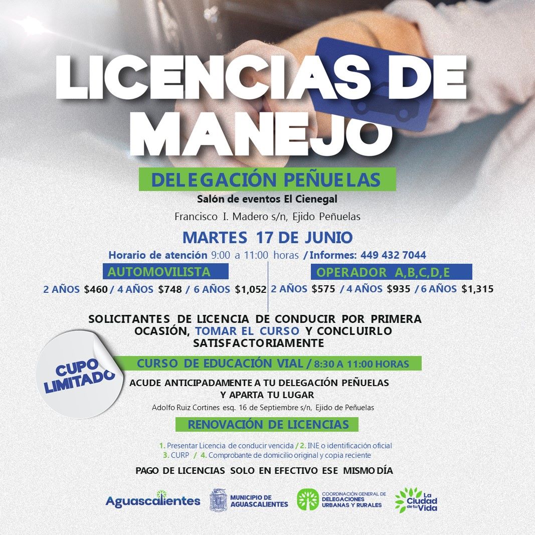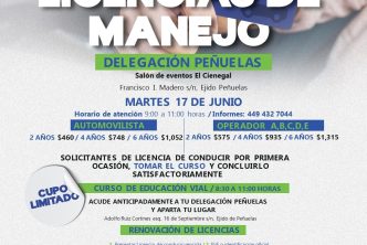 Por ello se hace una invitación para que este martes 17 de junio los interesados acudan al Ejido Peñuelas, en el Salón de Eventos “El Cienegal”, ubicado sobre la calle Francisco I. Madero s/n, de las 9:00 a las 11:00 horas. Para poder tramitar la licencia de manejo, se pide llevar licencia de conducir vencida, credencial de elector o identificación oficial, CURP, comprobante de domicilio y realizar el pago en efectivo ese día.