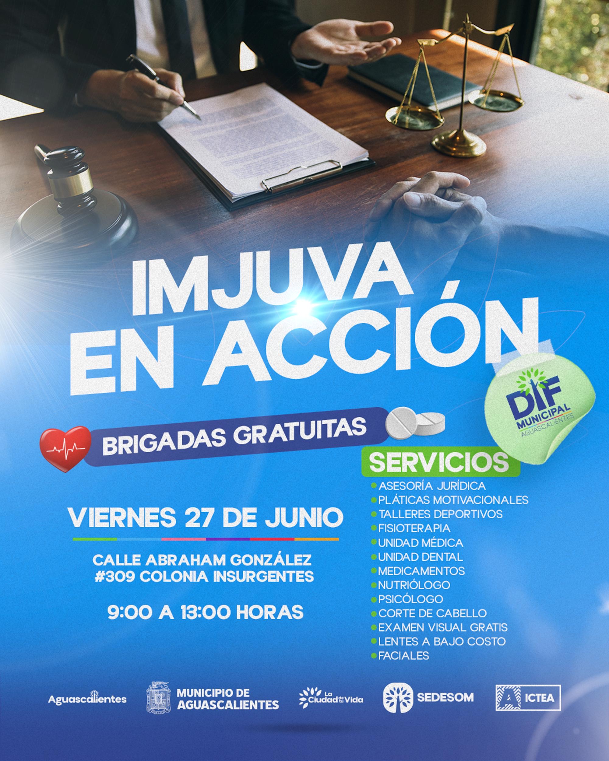El Municipio de Aguascalientes, a través del Instituto Municipal de la Juventud (IMJUVA), invita a la ciudadanía a participar en la brigada “IMJUVA en Acción”, en la cual la población recibe atención gratuita en servicios como asesoría jurídica, fisioterapia, unidad médica y dental, pláticas motivacionales, actividades deportivas, atención médica general, nutrición y psicología, entre otros servicios.