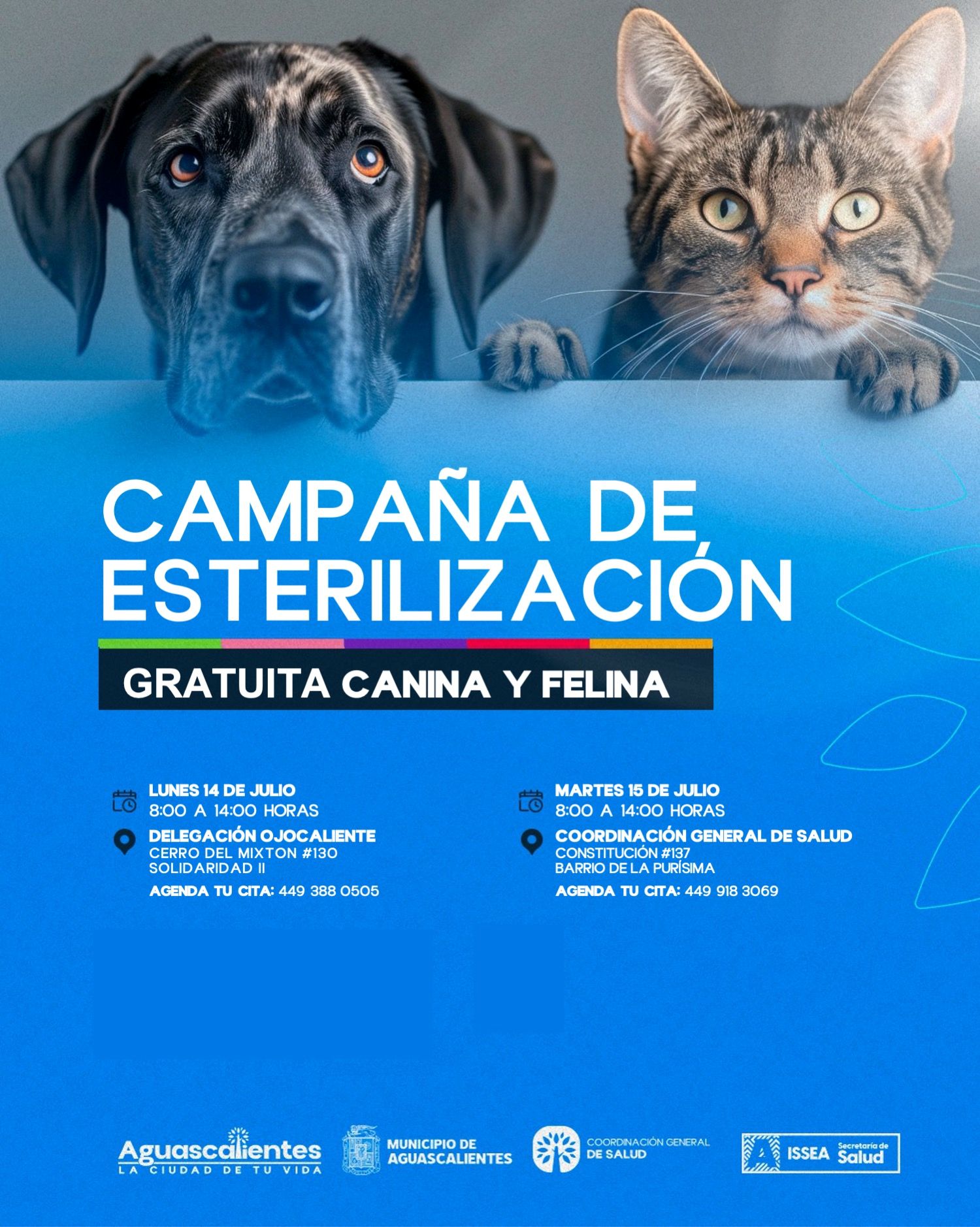 Se esterilizarán 60 perros o gatos por día, con cita, es necesario llevar copia de INE, una cobija y tener registro en el Padrón Municipal de Mascotas www.ags.gob.mx/padronmascotas.