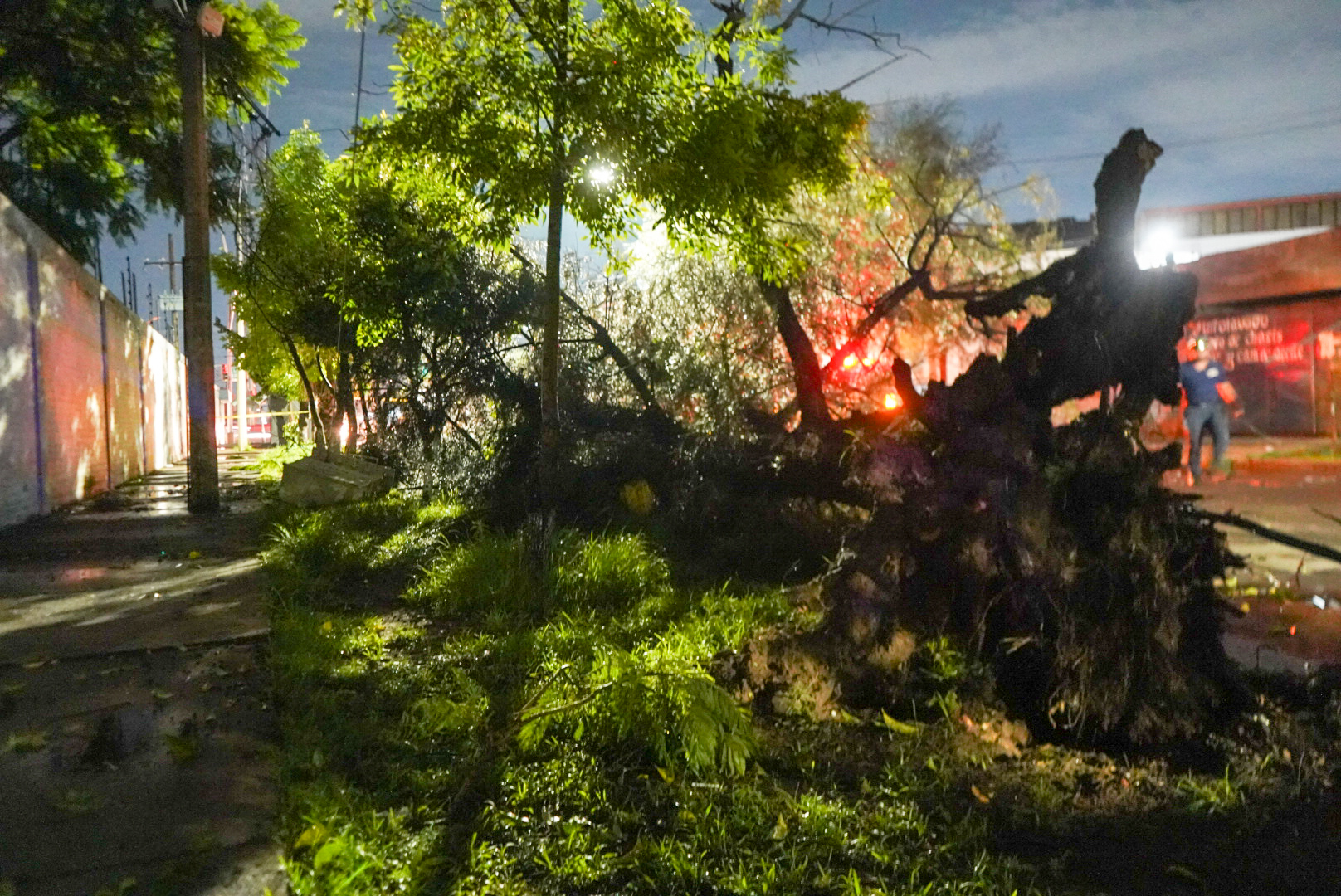 En esta zona, personal de la Coordinación General de Delegaciones, Servicios Públicos y Protección Civil trabajaron de manera conjunta para retirar los árboles colapsados, cuyas raíces cedieron ante el reblandecimiento del suelo y la fuerza del viento.
