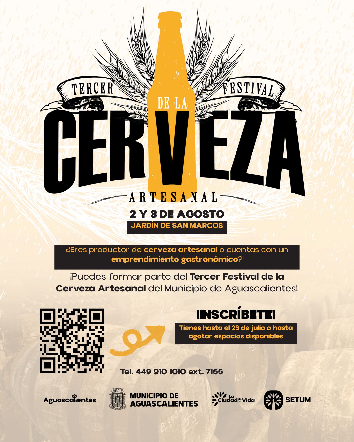 Municipio de Aguascalientes a través de la Secretaría de Economía Social y Turismo Municipal (SETUM) invita a productores de cerveza artesanal, cocineros y emprendedores del sector gastronómico a formar parte del Tercer Festival de la Cerveza Artesanal del Municipio de Aguascalientes, que se llevará a cabo los días sábado 2 y domingo 3 de agosto de 2025, en el tradicional Jardín de San Marcos.