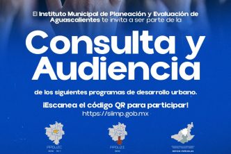 Como parte del proceso de planeación democrática y participación social, el Municipio de Aguascalientes, a través del Instituto Municipal de Planeación y Evaluación de Aguascalientes (Implan) invita a participar en la Consulta y Audiencia Ciudadana de la Elaboración de los Programas Parciales de Desarrollo Urbano, que incluye la Zona Urbana de Focalización (ZUFO) Industrial 2040 y Refom Peñuelas, así como la Primera Evaluación del Programa Parcial de Desarrollo Urbano de la ZUFO Centro.