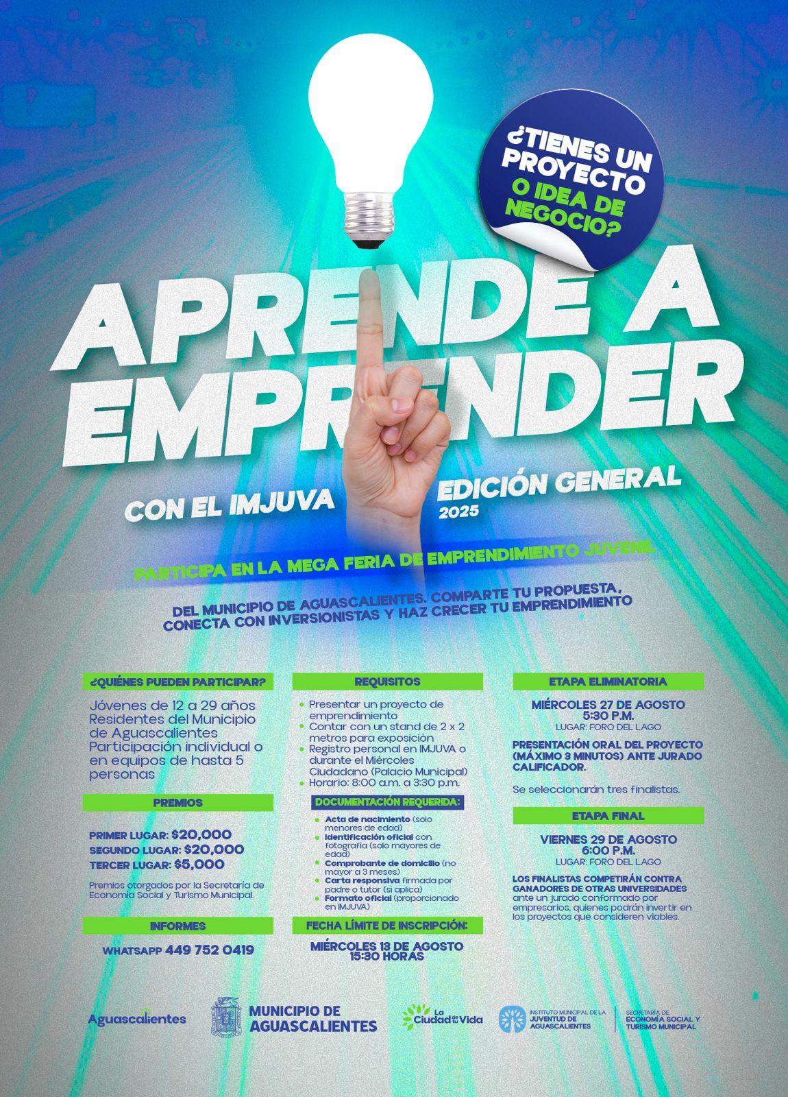 Con estas acciones, el Instituto Municipal de la Juventud reitera su compromiso de crear espacios que impulsen el talento, la creatividad y las aspiraciones emprendedoras de las juventudes de Aguascalientes. Para mayor información o dudas sobre la convocatoria, las y los interesados pueden comunicarse vía WhatsApp al número 449 752 0419.