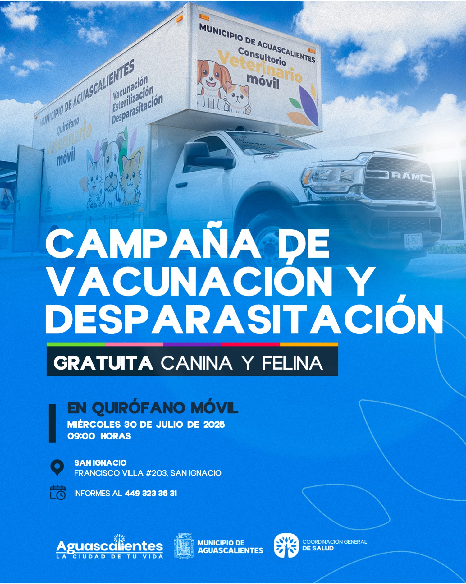 El miércoles 30 de julio, el quirófano móvil estará en la calle Francisco Villa #203, San Ignacio, a partir de las 9:00 horas, los interesados pueden solicitar informes al teléfono 449 323 36 31.