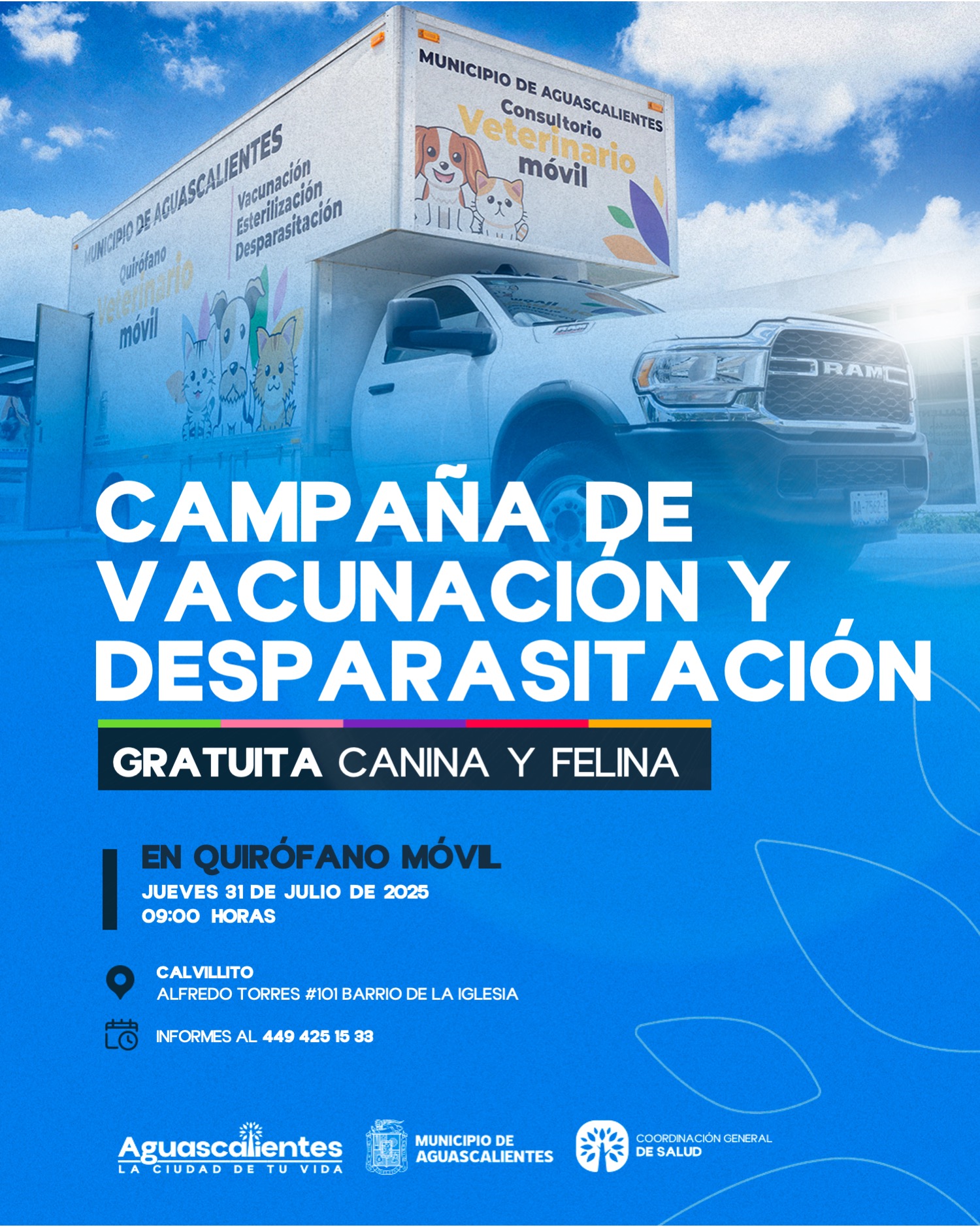El Municipio de Aguascalientes, a través de la Coordinación General de Salud, llevará los próximos 30 y 31 de julio, el quirófano móvil a San Ignacio y la comunidad de Calvillito, respectivamente con una campaña de vacunación antirrábica y desparasitación.