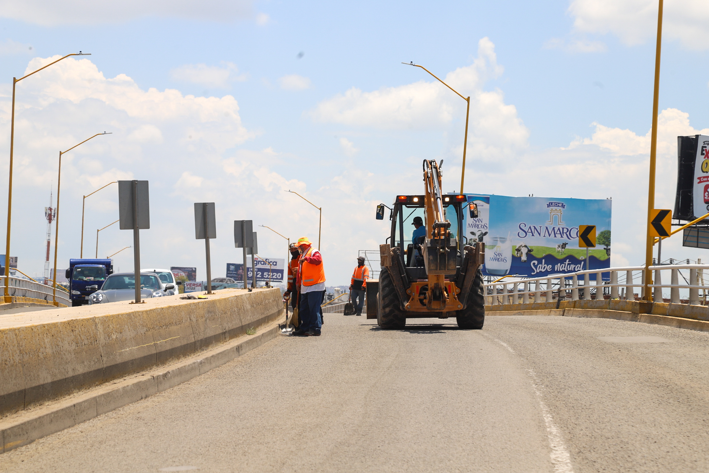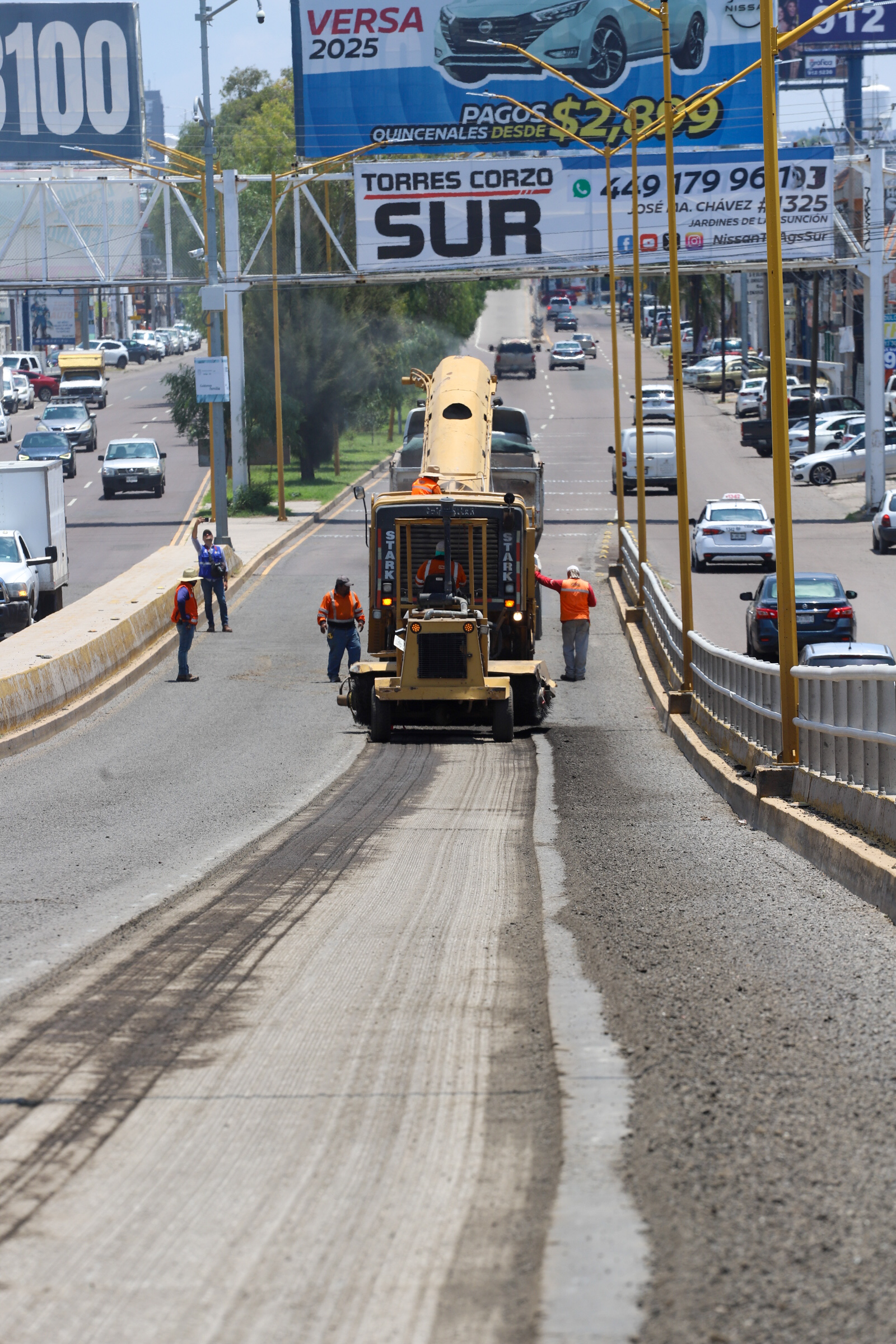Visitó el puente superior vehicular ubicado en Avenida Aguascalientes en el cruce con Avenida de los Maestros, en el cual se realizan trabajos de mantenimiento del pavimento asfáltico en ambas calzadas, así como el cambio de juntas constructivas para brindar una circulación mas cómoda y segura.