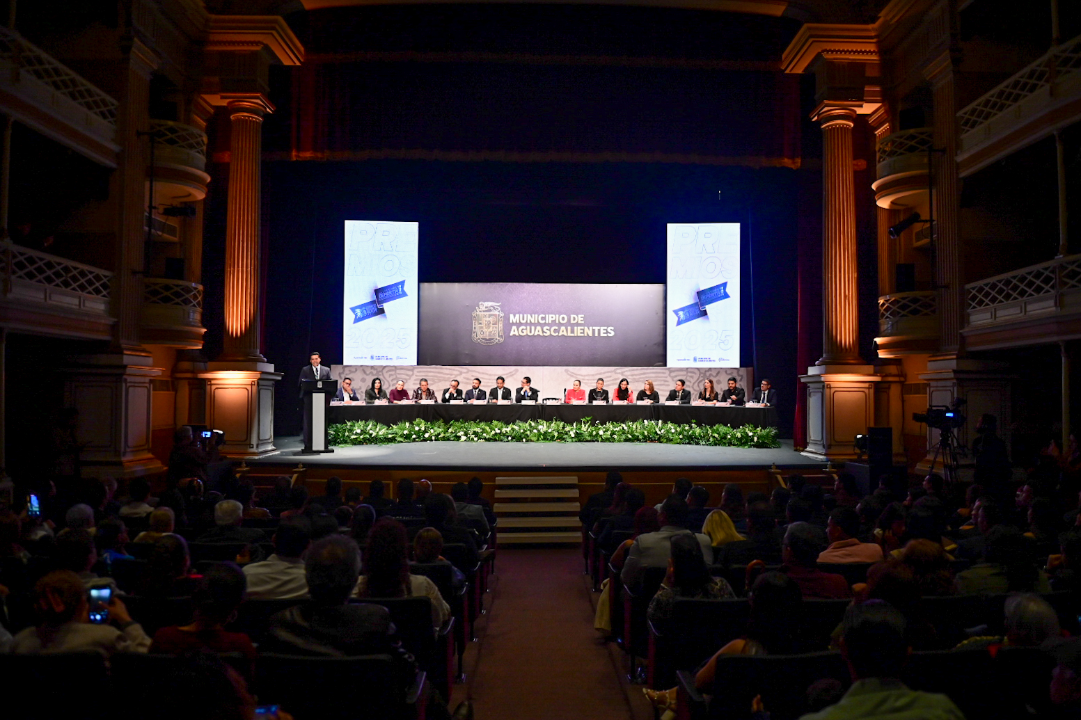 El presidente municipal, Leo Montañez, encabezó la sesión extraordinaria de Cabildo, en el teatro Morelos, en la que se realizó la entrega de premios al Mérito Deportivo y al Guerrero Azteca 2025, por parte del H. Ayuntamiento de Aguascalientes.