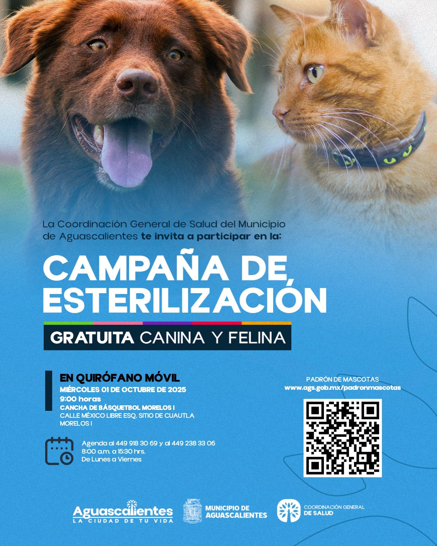 El Quirófano Veterinario Móvil del Municipio de Aguascalientes visitará los fraccionamientos Morelos 1 y Pensadores Mexicanos los próximos 1 y 2 de octubre de 2025, para ofrecer servicios gratuitos de esterilización, vacunación antirrábica y desparasitación, informó, María Teresa Rendón Esquivel, coordinadora general de Salud del Municipio de Aguascalientes.