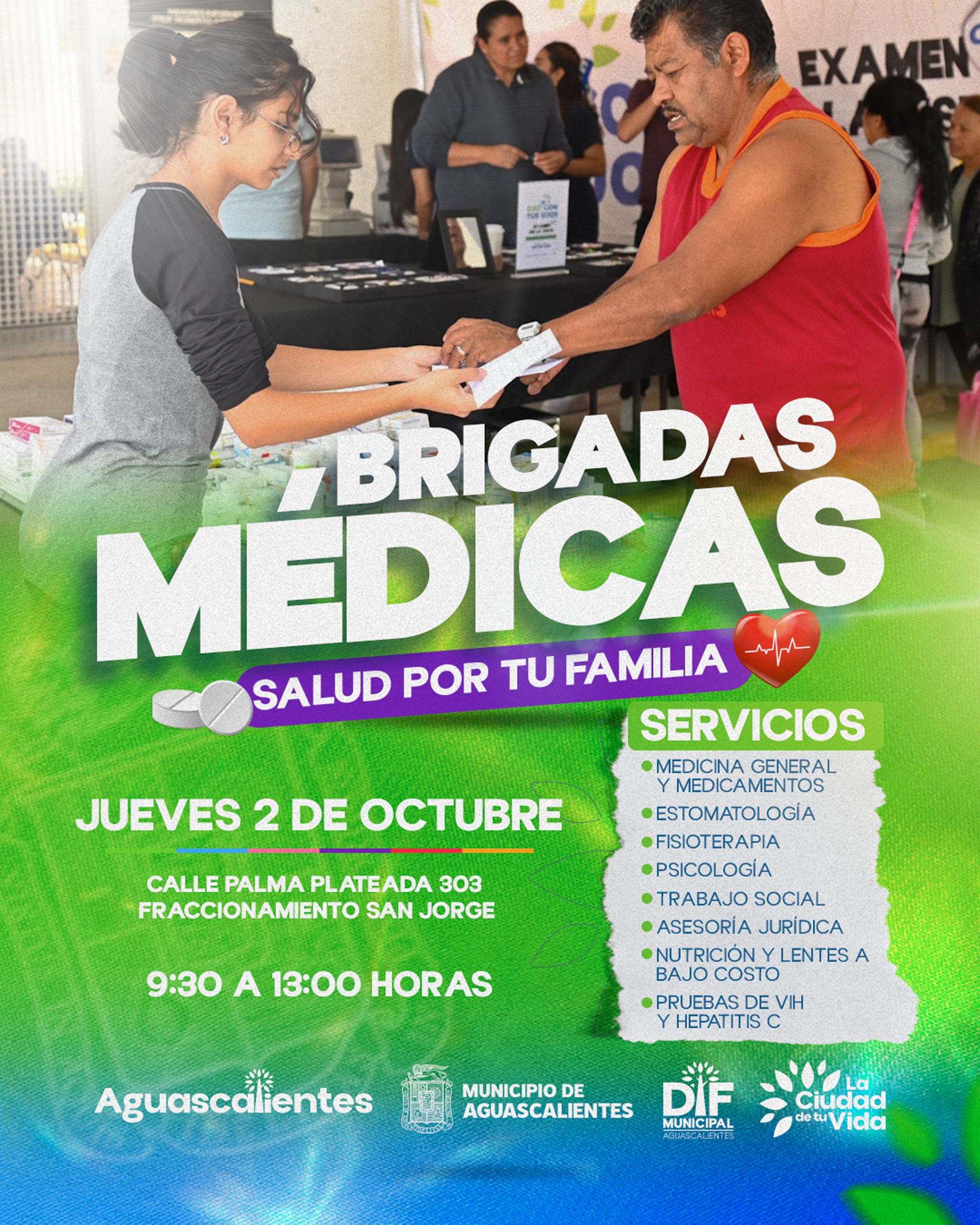 El DIF Municipal de Aguascalientes, en conjunto con la Secretaría de Desarrollo Social y la Coordinación General de Delegaciones, invita a la ciudadanía a participar en las brigadas médicas gratuitas, que tienen como objetivo acercar servicios de salud de calidad a las familias del municipio.