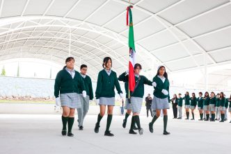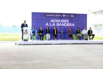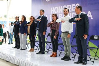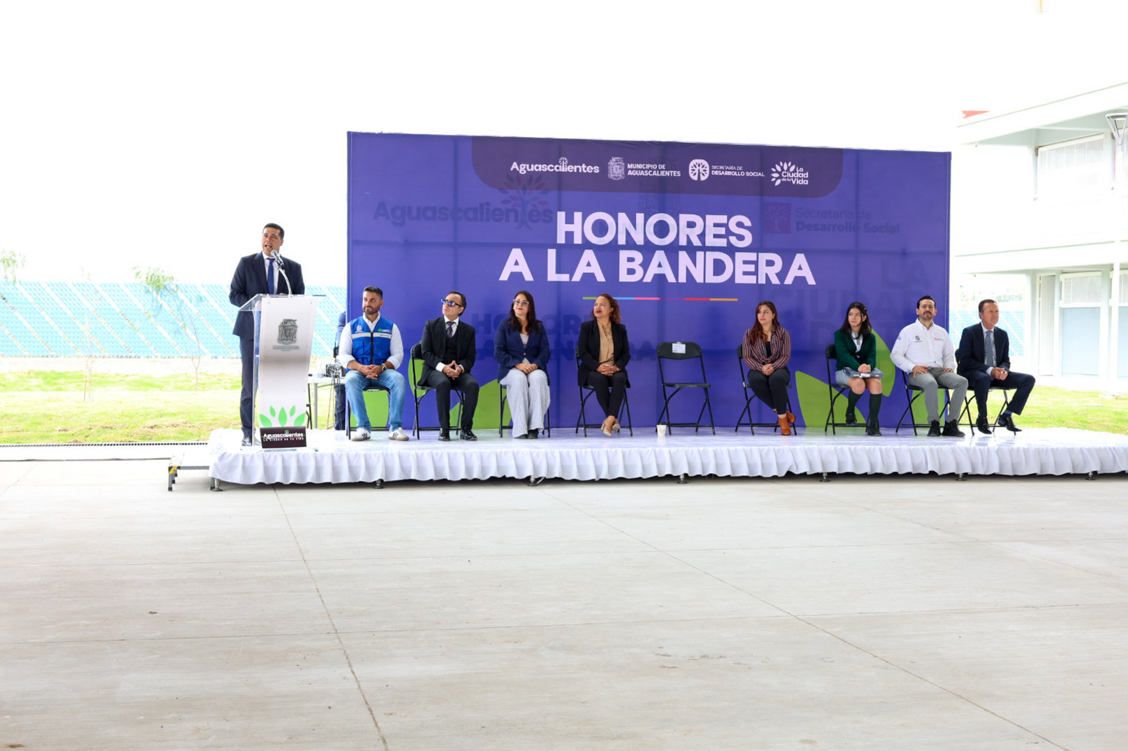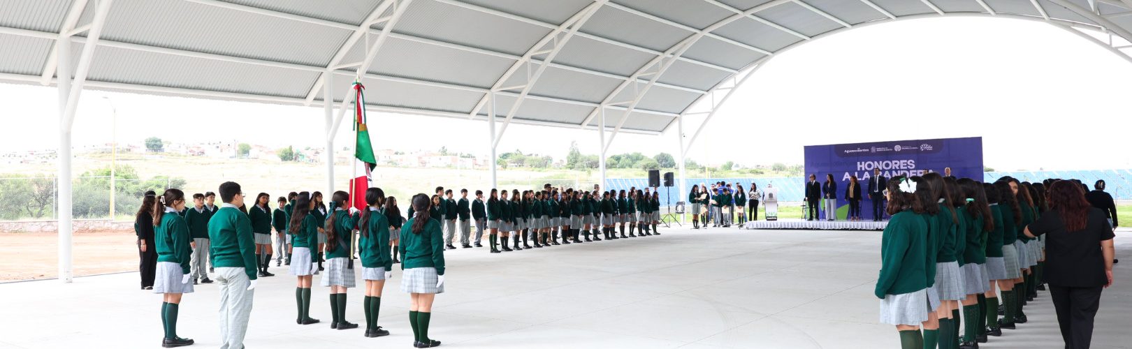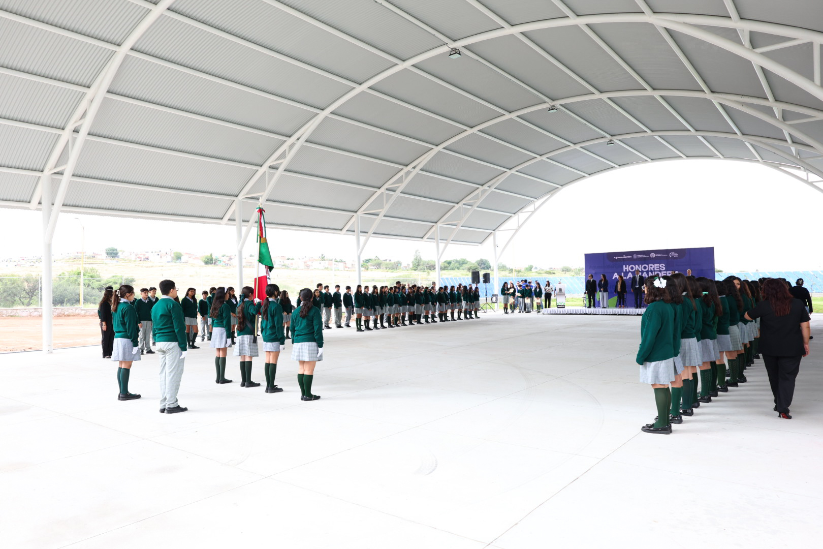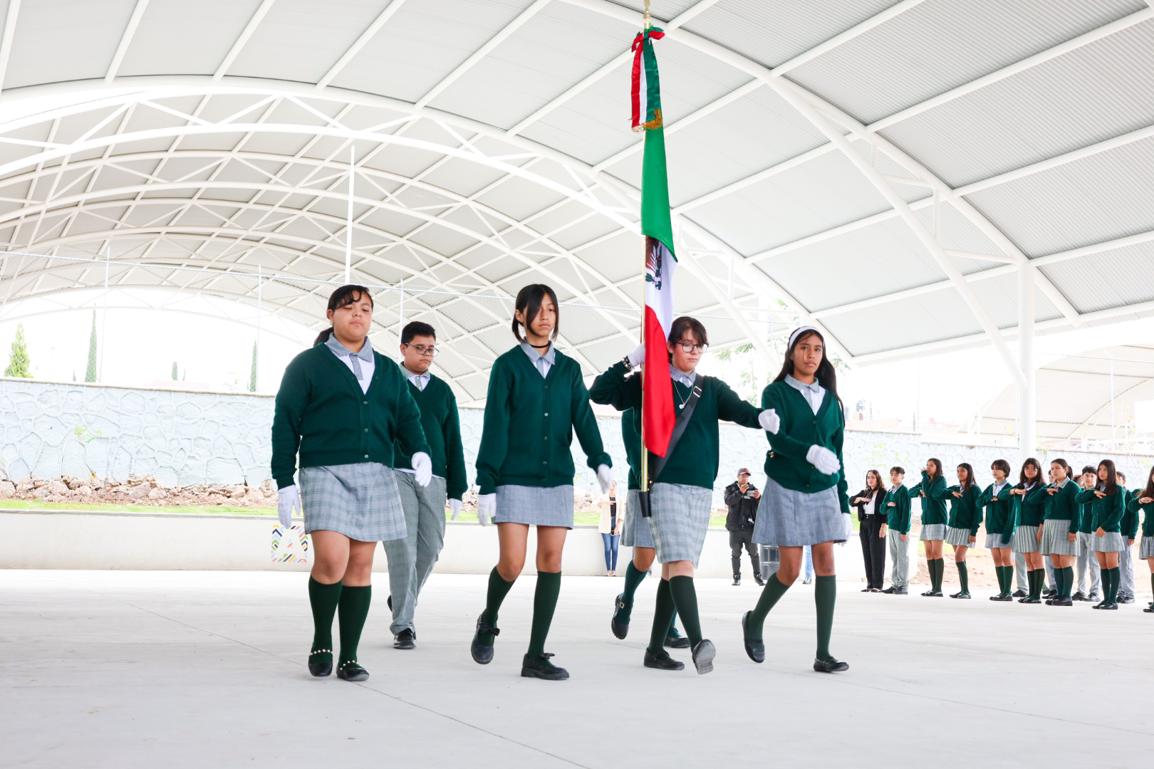 La mañana de este lunes, el presidente municipal Leo Montañez presidió la ceremonia de honores a la bandera en la Escuela Secundaria General No. 45 “Dra. María Teresa Jiménez Esquivel”, ubicada en Villas de las Norias.