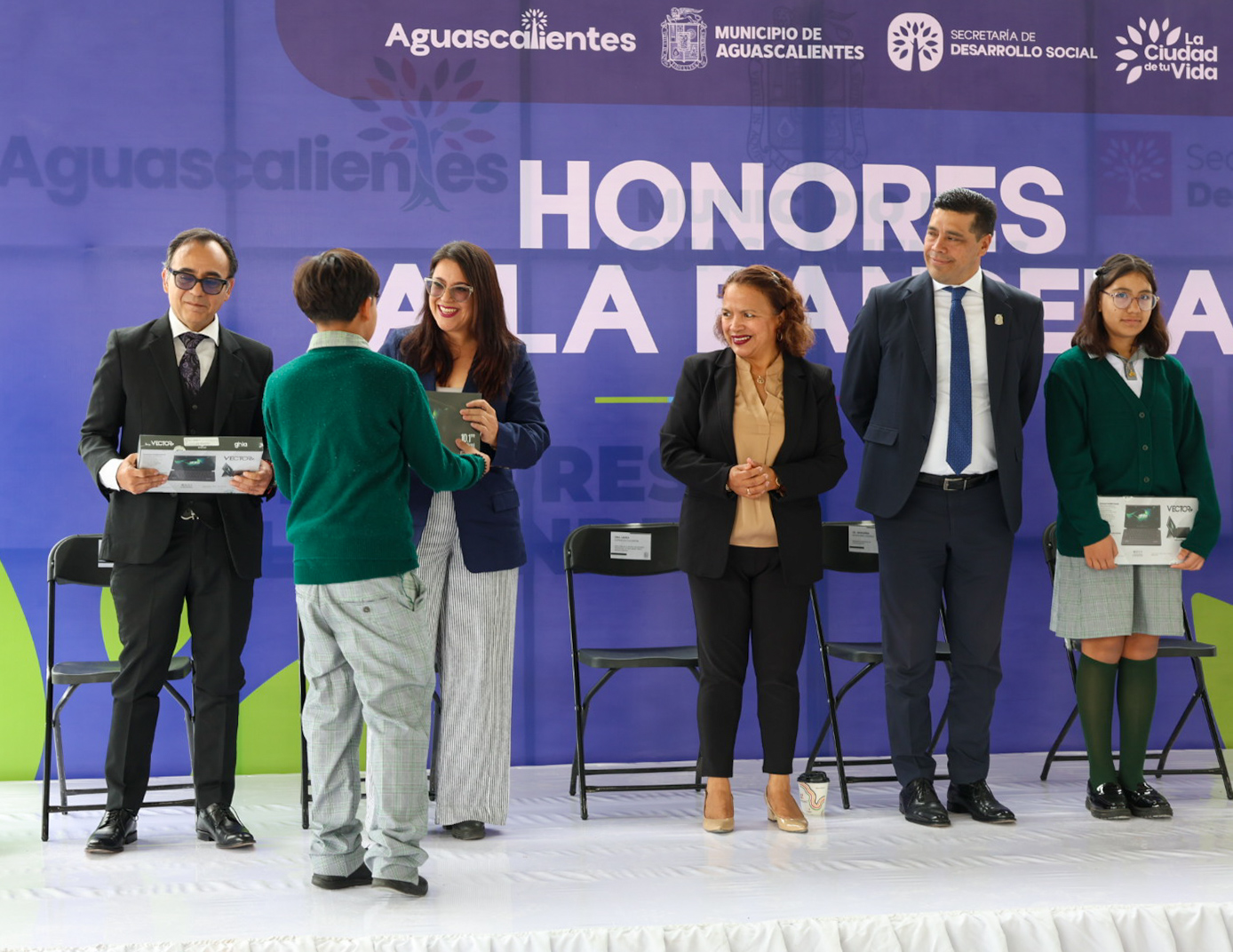 Durante la ceremonia, se realizó la entrega de material deportivo para que los alumnos cuenten con las herramientas necesarias para practicar deportes; asimismo, se reconocieron a Esther Solís Cisneros de 1º A, Ally Daniela Palos Silva de 1º B, Ricardo Gómez Hernández, de 1º C y a Iker Sebastián Fernández Esparza de 2º A, como los mejores promedios de la escuela, a quienes se les entregó un dispositivo tecnológico.