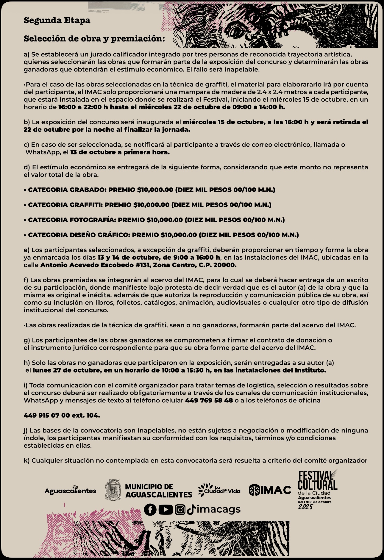 El Instituto Municipal Aguascalentense para la Cultura (IMAC), invita a creadores locales a participar en el Concurso de Gráfica Urbana 2025, un espacio que busca reconocer, difundir y estimular el talento artístico en las disciplinas de grabado, diseño gráfico, fotografía y graffiti.